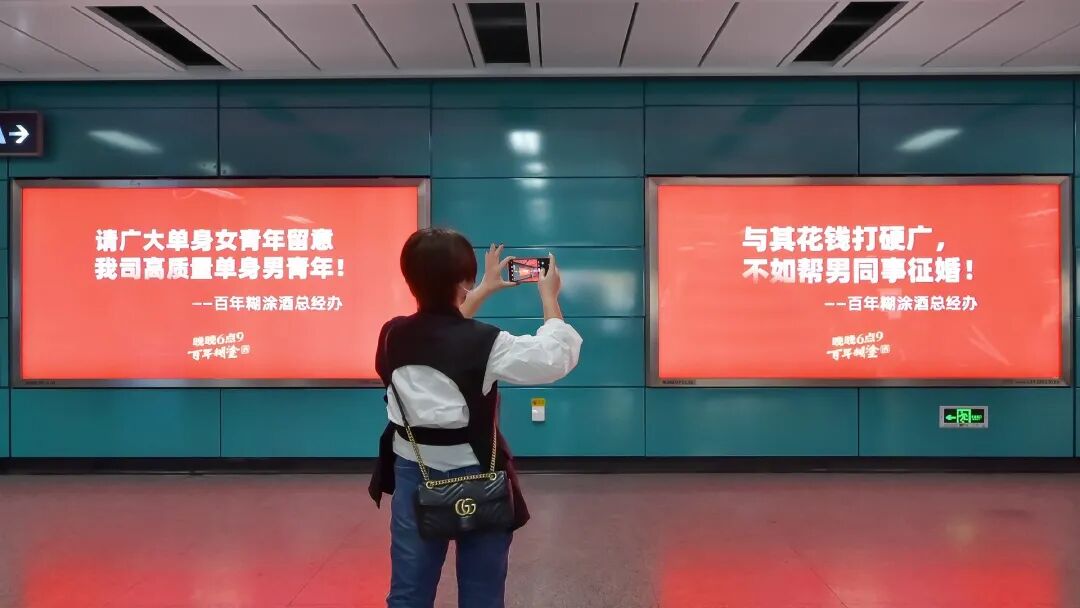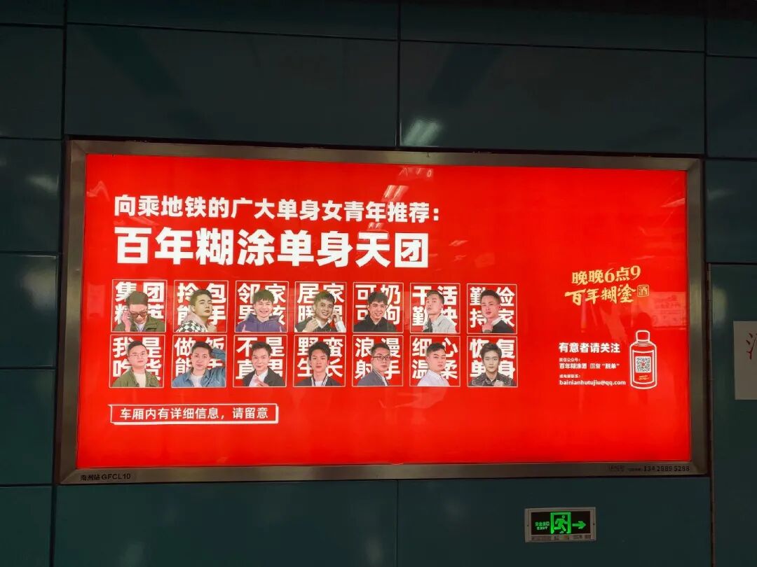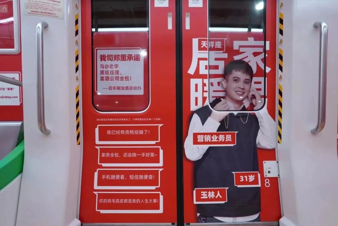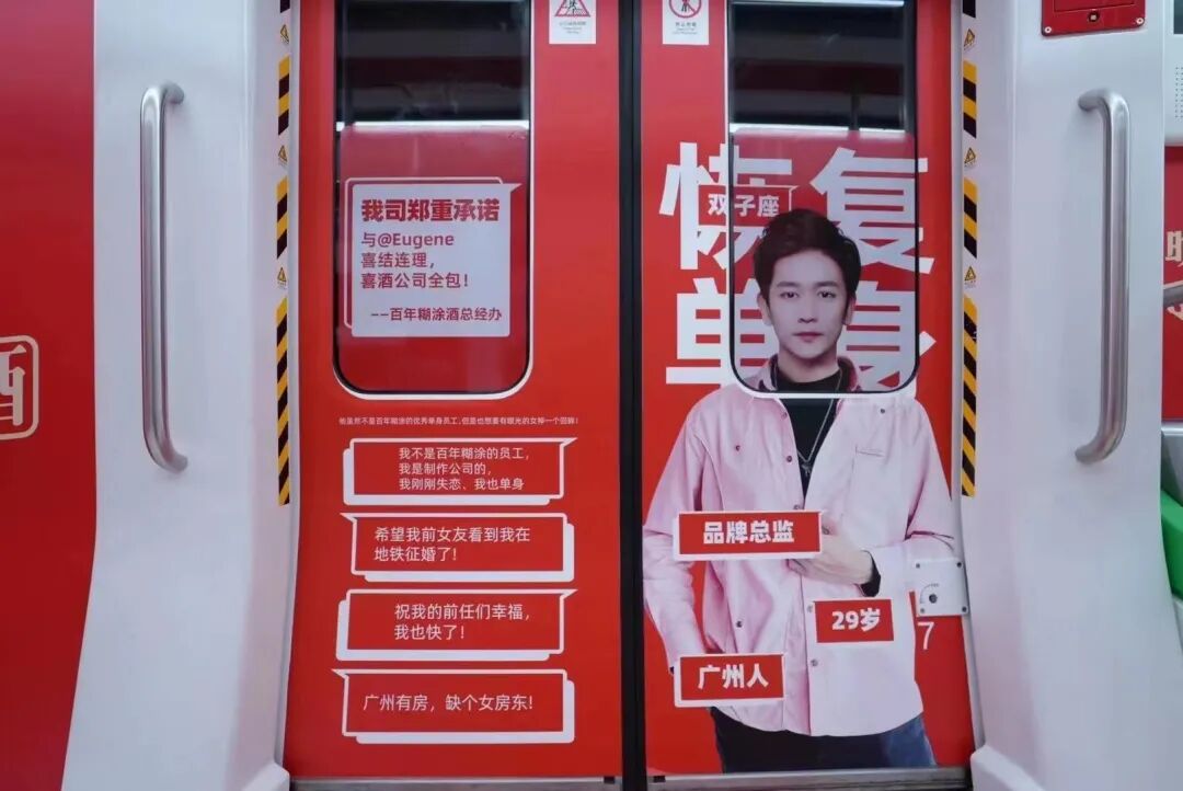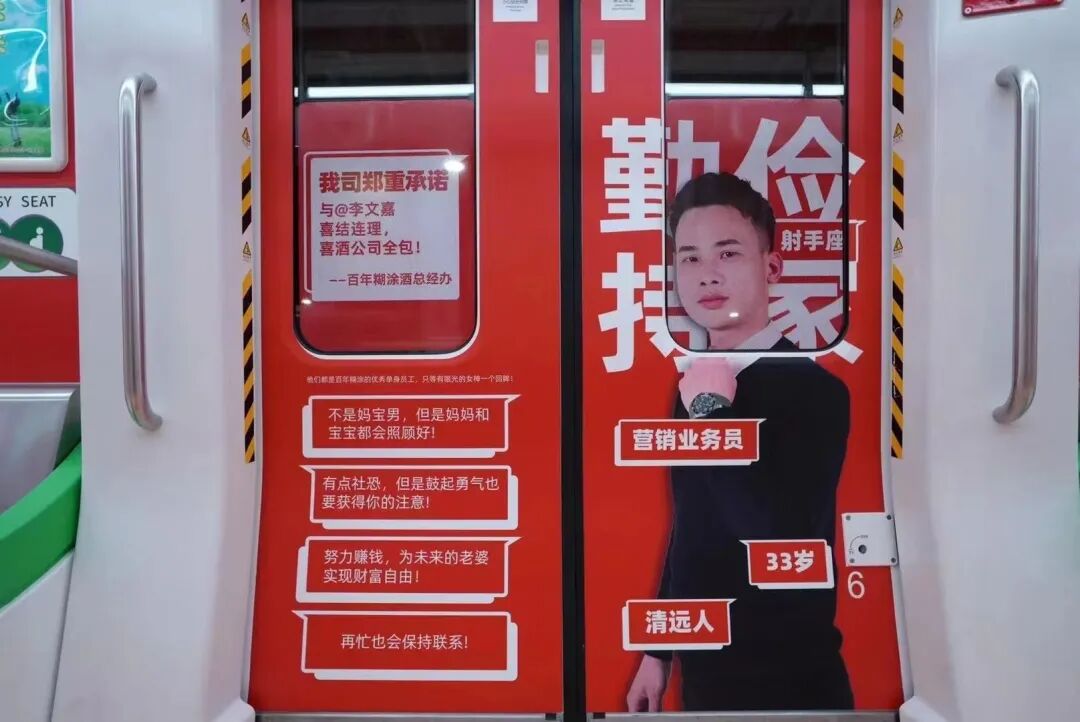 这不,最近#广东老板才是催婚的天花板#登上微博同城热搜榜第一。原来是那个卖酒的百年糊涂,老板竟然在地铁上为全公司20名男同胞征婚,征婚成功喜酒全包。莫非是股票一跌再跌,白酒行情不好,百年糊涂改行办起“相亲角”了?事情的经过是这样的,原本只是公司有人反映集团内部分男青年因工作繁忙无暇解决个人情感问题,怂恿老板帮忙解决,没想老板在这个问题上认真了!于是老板为员工包下广佛线多个站点和专列来征婚,向乘坐地铁的广大单身女青年推荐公司单身天团。广州的上班族们坐地铁,惊奇地发现竟有人在地铁上张贴征婚广告,红底白字尤其显眼。01