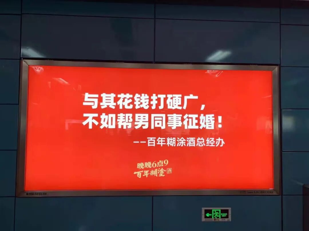 对于广东人来说,百年糊涂算是一个老品牌,它面临的一个巨大的问题就是品牌如何年轻化?品牌年轻化当然要从年轻人关注的问题入手,百年糊涂这个征婚广告成功抓住了年轻人的两个痛点。首先,单身问题是很多年轻人当前急需解决的问题,过年回家最怕的就是催婚,而老板帮员工找对象,直击痛点了属于是。其次,现在996工作压力太大,很多年轻人觉得结婚成本太高了,因此就不愿意结婚了,何况办酒席。一句:“我司承诺,与某某喜结连理,喜酒公司全包!”文案直戳人痛点,帮助征婚对象解决办酒席的难题。其实这不是百年糊涂第一次在户外做这种有趣的广告了。凭借“自黑式”的创意文案吸引了不少路人的目光。