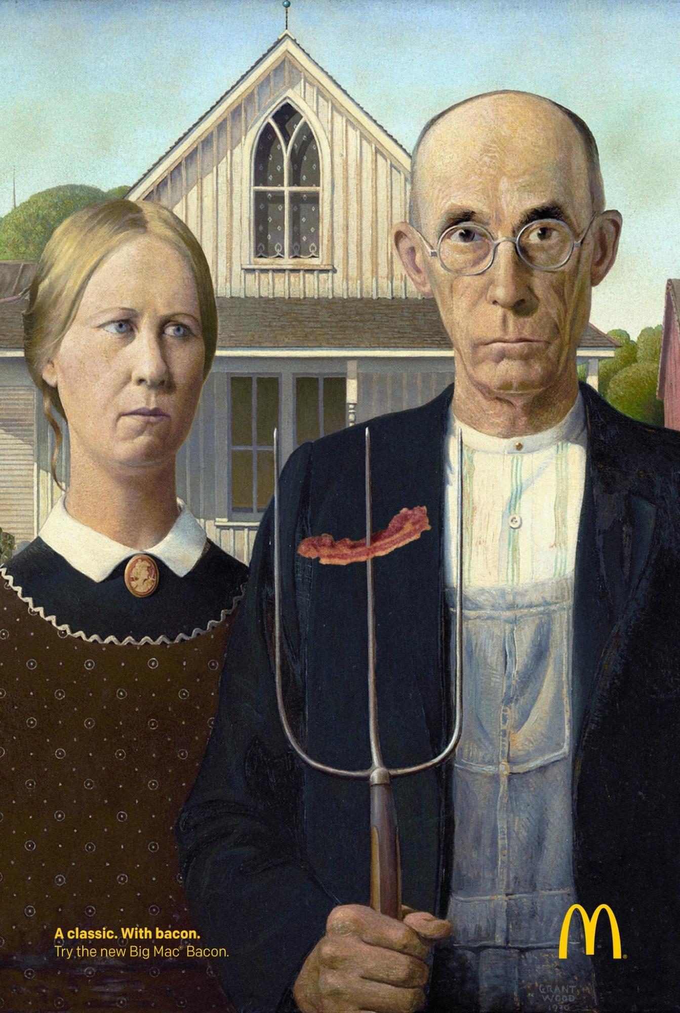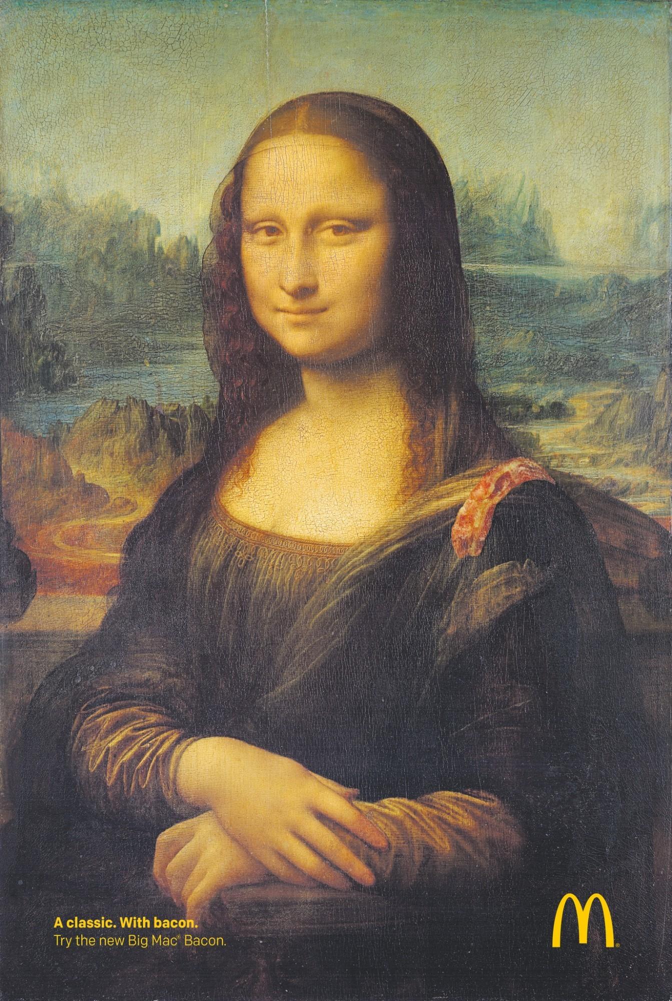 早在 2020 年1 月,瑞典斯德哥尔摩 NORD DDB 就曾推出过《A Classic, With Bacon 经典,带培根的》,配合同期推出的带培根的麦当劳巨无霸,一条条培根出现在了包括《蒙拉丽莎》、《梵高自画像》、《美国哥特式》等名画中。