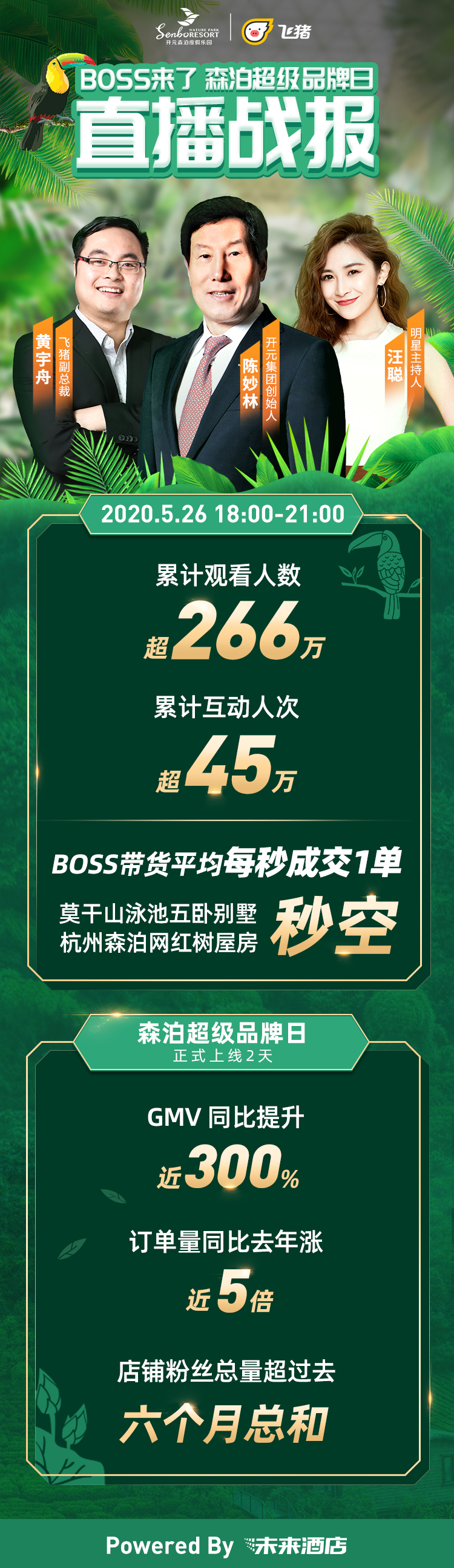 为表达对飞猪直播间粉丝的诚意,陈妙林还带来了独家新品,6898元首发莫干山森泊新品5卧泳池别墅秒空。整场直播平均每秒成交1单,杭州开元森泊网红树屋套餐同样秒空。直播同步进行的开元森泊飞猪超级品牌日期间,酒店成交量同比涨3倍。最近刚结束的飞猪合作薇娅首个杭州城市文旅专场中,杭州森泊网红木屋秒空8000套。