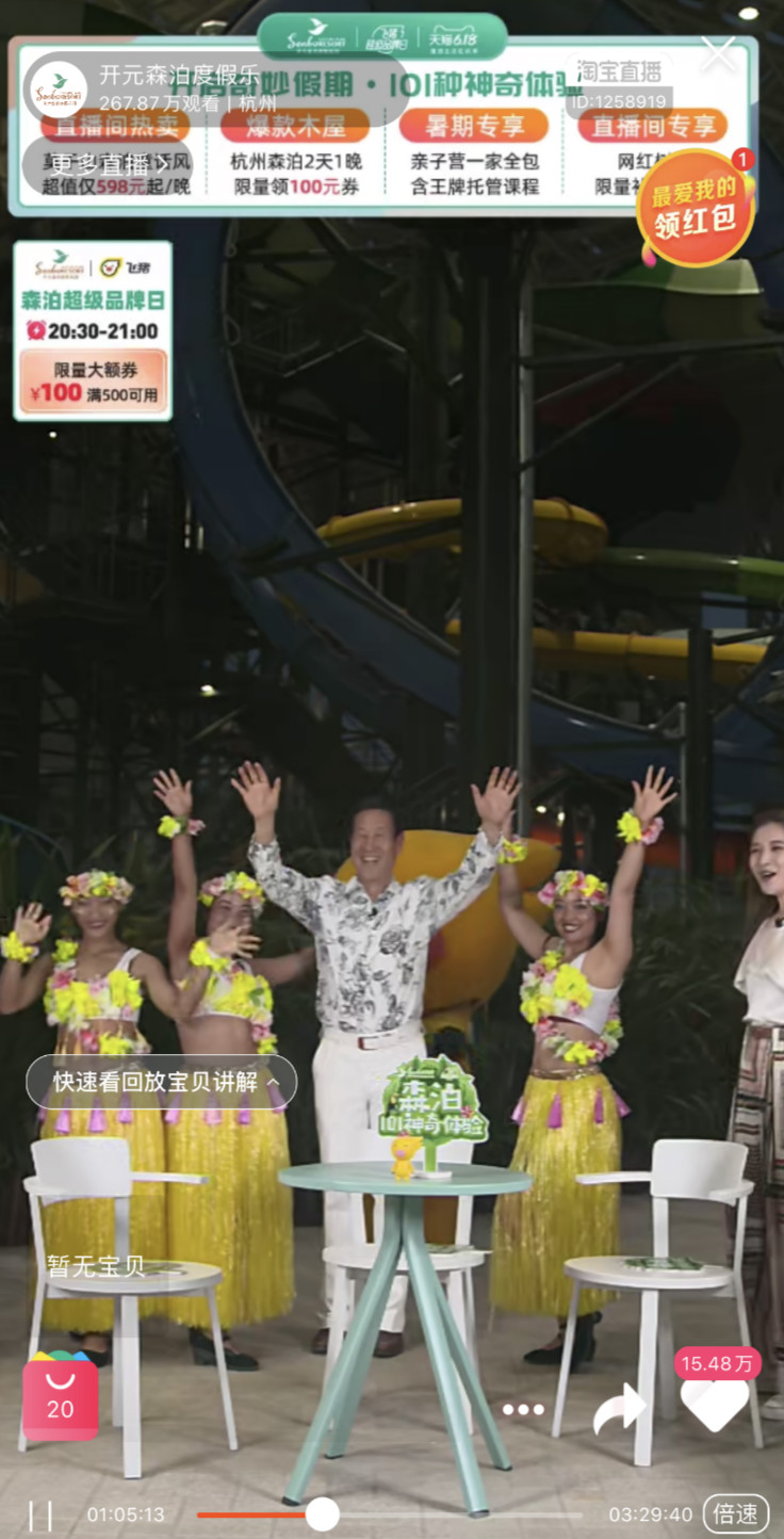 5月26日晚,“中国民营酒店第一人”、开元旅业集团创始人陈妙林在莫干山森泊水乐园开启BOSS直播首秀,并通过淘宝、飞猪、支付宝和优酷四端直播。短短3小时直播吸引266万人涌入直播间。