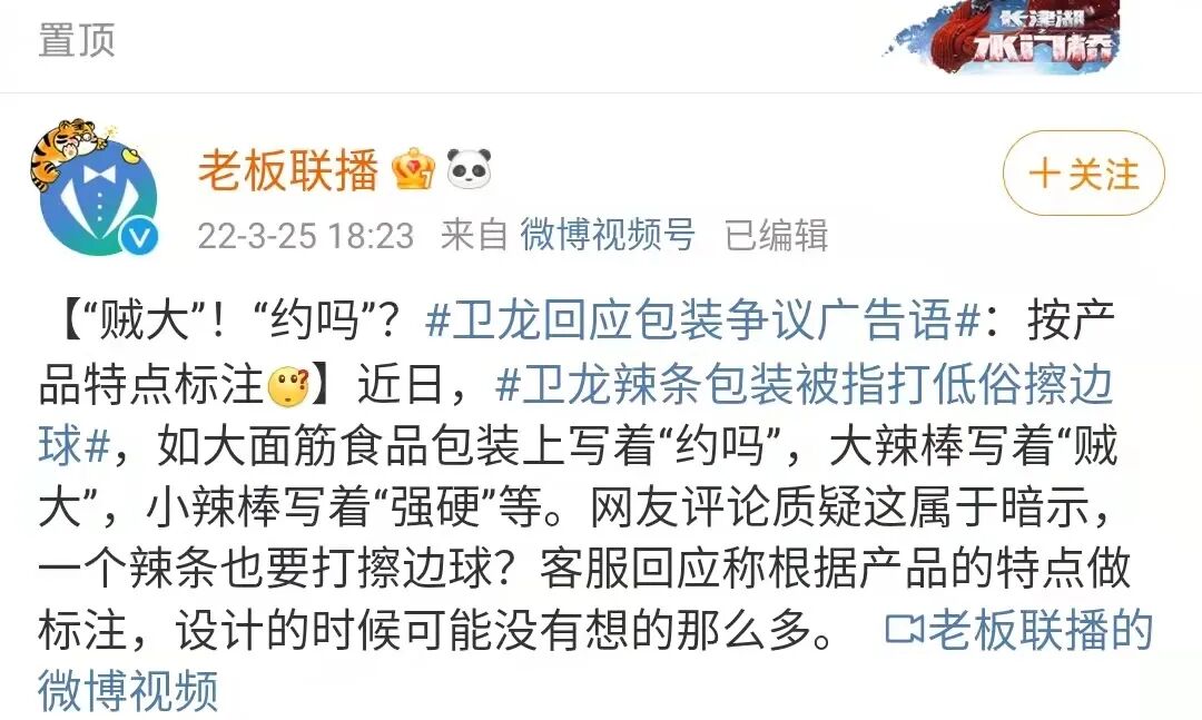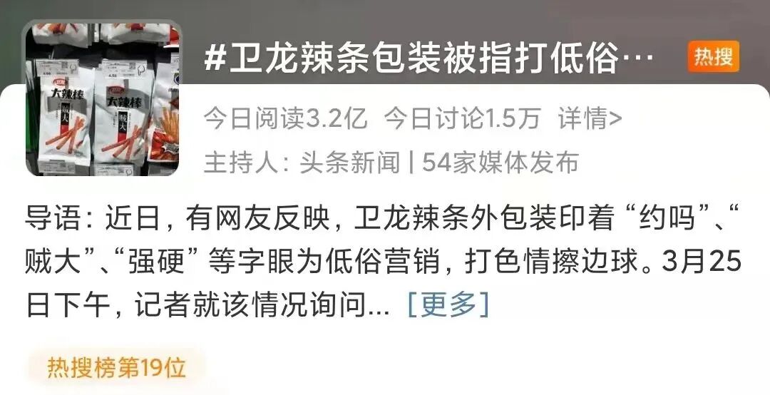 本想着今晚辣条配冰棒,来个心中无曲自然嗨。没承想我最爱的卫龙竟然又翻车了?!前两天,有网友反映卫龙辣条搞色情擦边球,包装上的“约吗”、“贼大”、“强硬”等字眼涉嫌低俗营销。结果一石激起千层浪,吃辣条的和不吃辣条的都沉默了!咱就说这都什么年代了,21世纪马上就过去四分之一了,还有品牌敢玩这一套?!前辈们翻车翻的车轱辘都找不到了,在“网红江湖”摸爬滚打这么多年的卫龙不可能不知道吧。这不是明知道萧敬腾开演唱会,还硬着头皮不打伞——缺根弦嘛!设计的时候并没有想这么多,这只是单纯的文案设计,都是根据产品的特点进行的标注,并没有其他含义。大部分网友表示举报者有点“过于严格”了,卫龙换包装多年了,2017年一直这个风格。现在拿出来说事有点不地道。吃货们表示,有没有一种可能,人家形容的是辣条贼大、贼大、贼棒!作为一个吃货,我和很多人一样,从始至终并没有去在意上面写的什么,更多的的是关注了辣条,反而有人这么一提,才让人发现写了啥。这一部分网友将争论提升到了精神文明的高度,认为中国人的想像惟在这一层能够如此跃进,想象力爆棚:约还有约会、约客户、约饭、约组织、约束、约谈、约战、约稿、约架、约球…为了卫龙的清白,还有人搬出@共青团中央也“约吗”。另一方则认为,就是赤裸裸地色情擦边球,卫龙别洗了!在这一波网友的认知里,性擦边球的营销和广告,都熟练掌握了“心眼脏看啥都脏”的堵嘴话术技巧。二是大众的价值观出了问题,认为“约吗”跟辣条有半毛钱关系没有,这就是赤裸裸的擦边球,卫龙在糊弄大众。话说到这份儿上,在舆论漩涡里为了卫龙吵得不可开交的网友已然谁也说服不了谁。正如有位网友所说:本来也觉得没什么,但现在就感觉别扭了。就像甄嬛抱起的被角,一旦接受了某种设定就再也回不去了。某种程度上来说,不管真相如何,卫龙是跳进黄河洗也洗不清了。从卫龙这一系列包装的整体来看,其实包装上并非只有“约吗”、“贼大”、“强硬”这三个词,还有“冷静”、“任性”、“压惊”等诸多词汇。把众多词汇包装放在一起,确实很难让人产生擦边色情的联想。但如果单独把那三个词汇拎出来,也很难不让人产生擦边色情的联想。某种程度上来说,这就像电影剪辑,我想问的是,经过刻意剪辑、拼凑的事实还是事实吗?在我看来,卫龙在主观上并没有擦边色情的想法,但在客观上却给某些人留下了把柄。在国内,性教育没见全面且正经系统搞起来,社会上对“性”的风气也是整天扭扭捏捏、遮遮掩掩。但矛盾的是,对于各种“性”话题的讨论却是如火如荼,究其原因在于传统文化的影响之下,大众对“性话题”的过度敏感。回到卫龙的话题本身,能不能被认定为低俗,本身也是问题。如果单独的把“约吗”都成为低俗的话,那网络上低俗的语言多了。其实面对诸如卫龙的所谓色情擦边球,我们需要的是正经的性教育,而不是这种充满想象力无谓调侃与争吵。