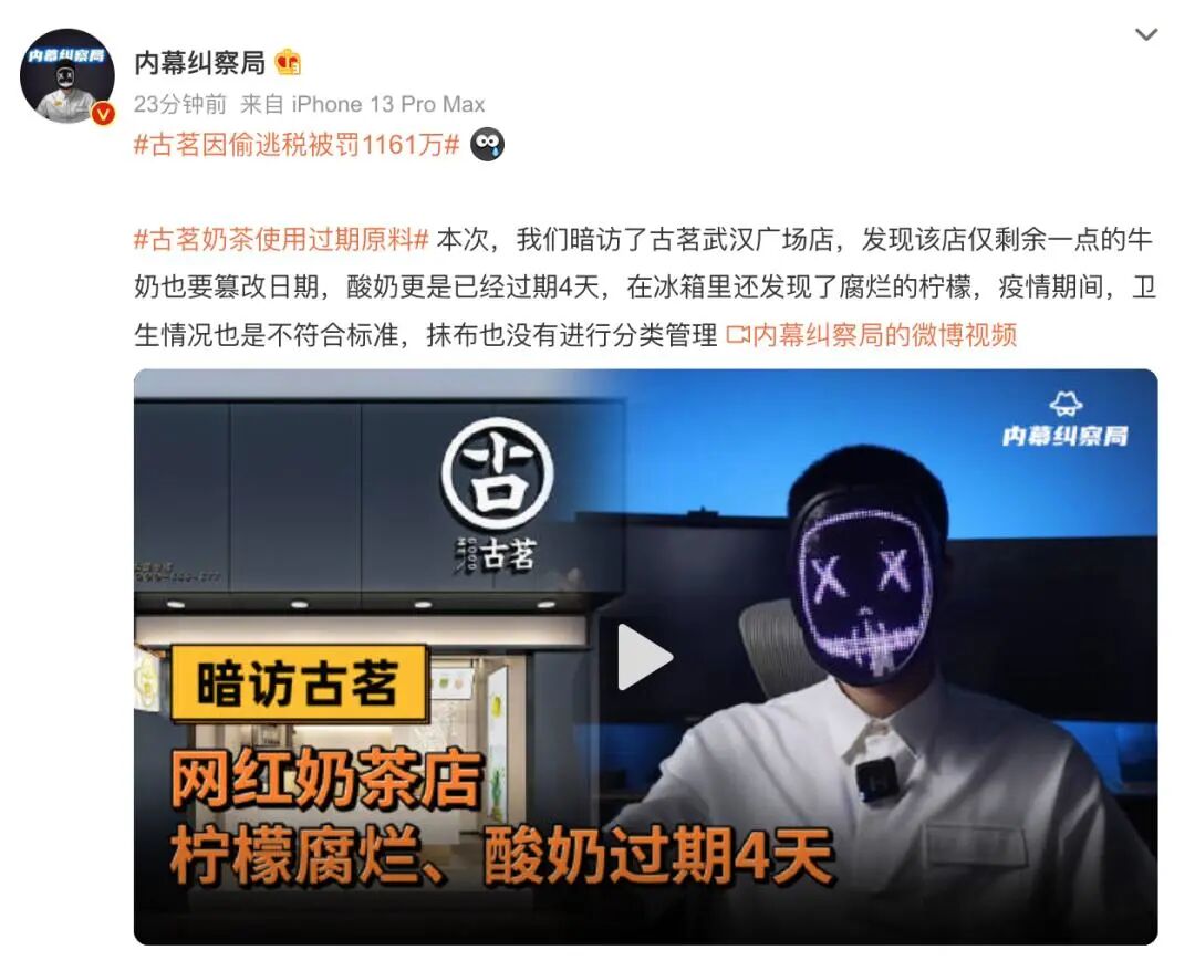 真假先不论,但两年前就被举报偷税漏税,如今才被税务机关爆出,看来真是无风不起浪。今年2月,古茗还陷入食品安全风波。有媒体报道称古茗某门店存在使用过期酸奶、腐烂水果的情况。