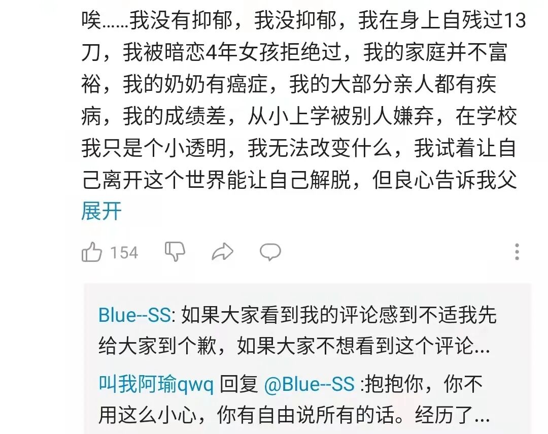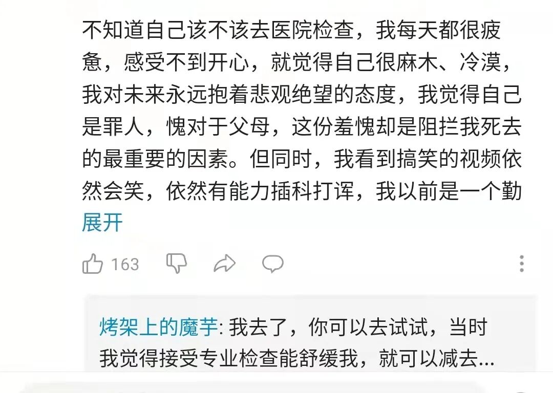 评论区更是成为不少年轻人的心灵“树洞”,满是网友们倾述或自己或家人抑郁、自残的经历。
