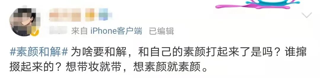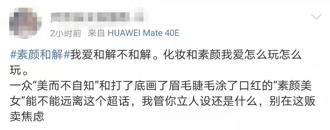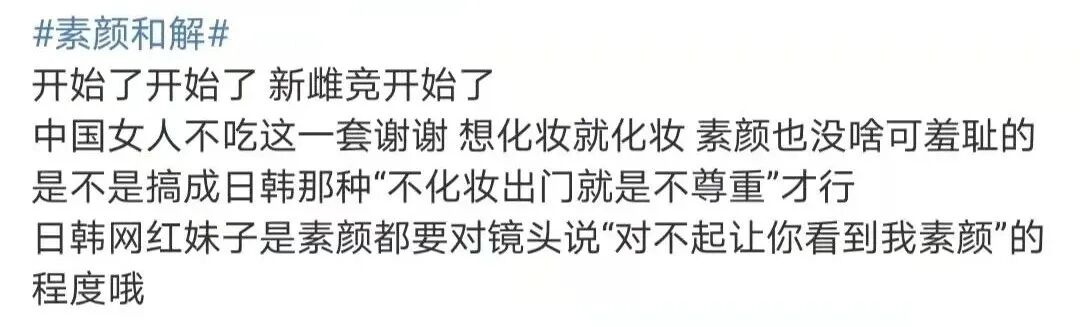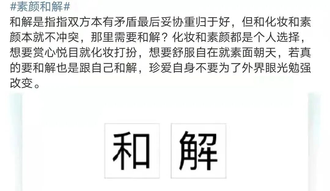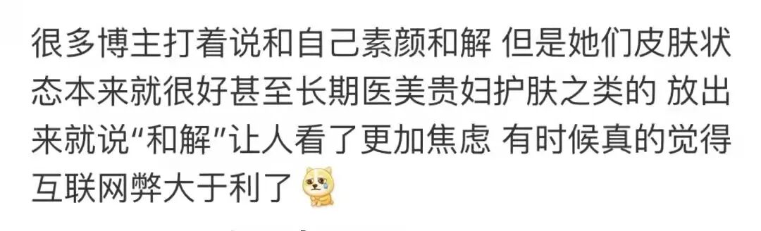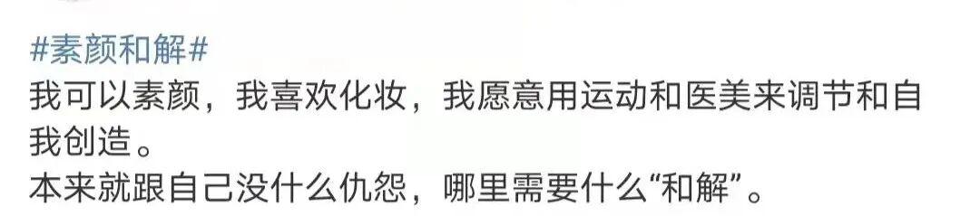 试想下,化个妆就被扣上了不敢正视自己、不爱真实的自己的标签,是不是离离原上谱?而另一方面,吃了颜值红利的美女呼吁和解,很容易就演变成借机秀美貌吸引流量,毫无说服力。再者,如果要依靠观看别人平凡的素颜获取自信,本质上还是陷在颜值比较的逻辑怪圈。承认容貌是衡量女性自信的唯一标尺,正是变相制造容貌焦虑。不管是化妆还是素颜,这些外在条件都不足以动摇我们。