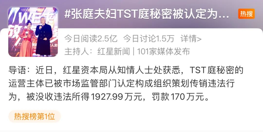又上热搜了!自去年底,张庭夫妇旗下品牌“TST庭秘密”因涉嫌传销被立案调查之后,最近有了新消息。