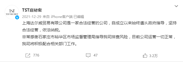 在公司被查处的消息曝光之后,2021年12月29日,TST秘密通过官方微博发布声明表示:“达尔威是一家合法经营的公司,运营一切正常。”张庭夫妇还对该微博进行了转发。