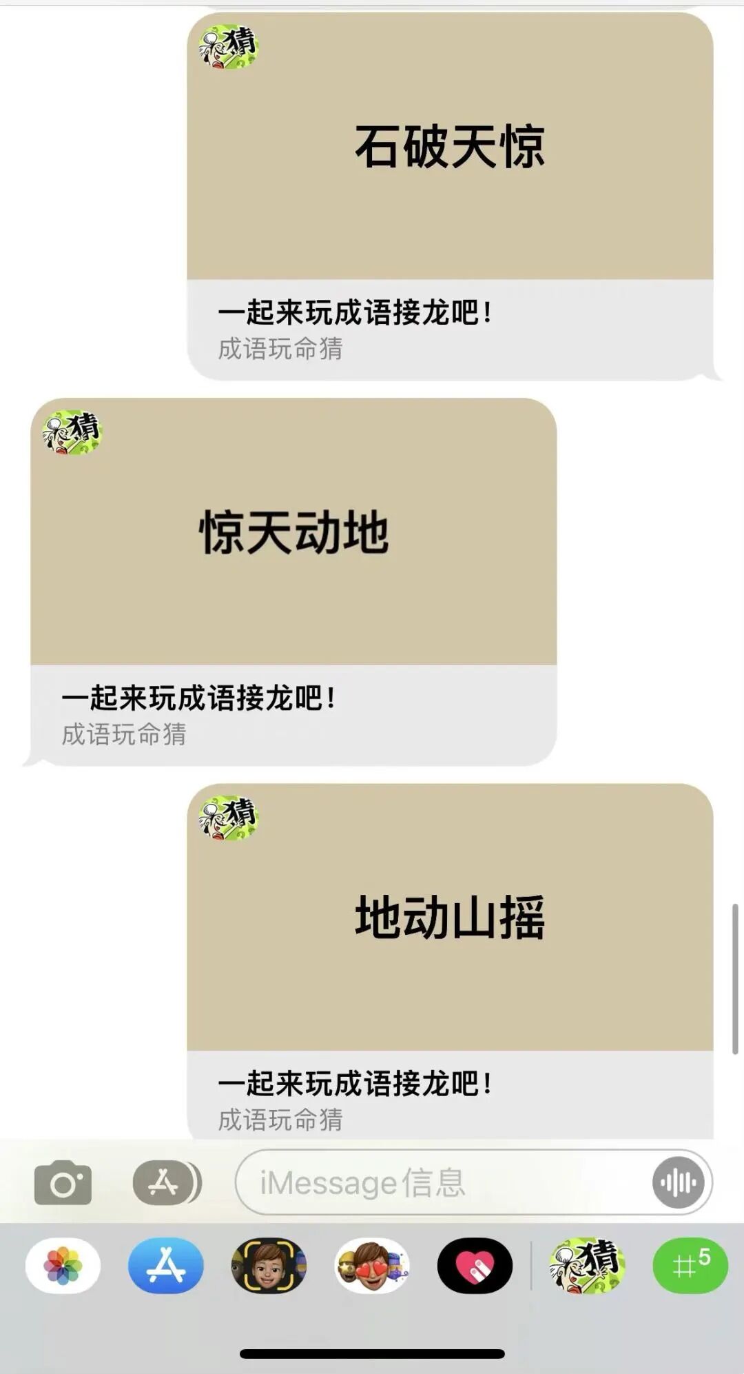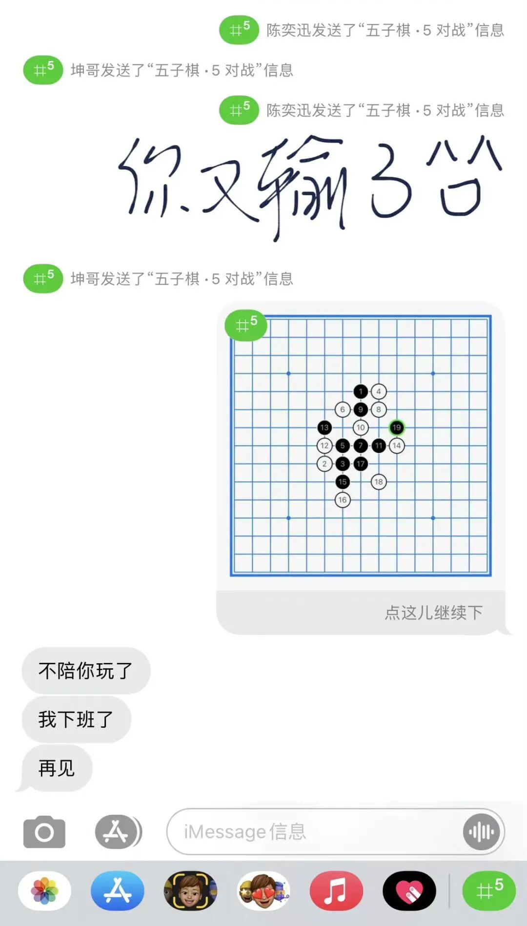 除了五子棋,还可以玩井字棋和成语接龙,据说国外iMessage可以下载更多。不过这几款游戏对于上班摸鱼来说已经绰绰有余(