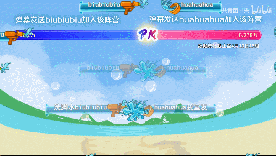 弹幕分为“biubiubiu”和“huahuahua”两个阵营,发送相关弹幕,就可以加入并支持某个阵营。