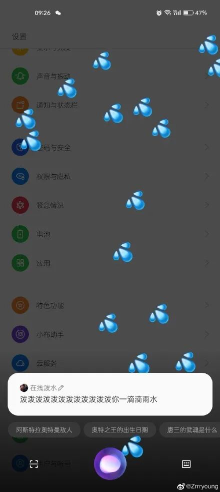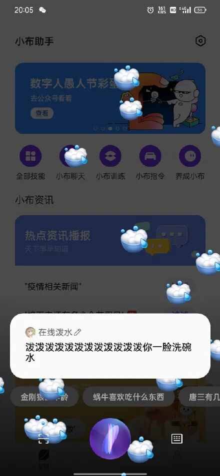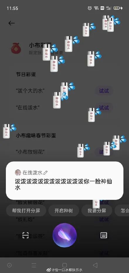 玩法很简单,只要你对着手机助手小布发出指令“在线泼水”,就会收到小布泼的水。