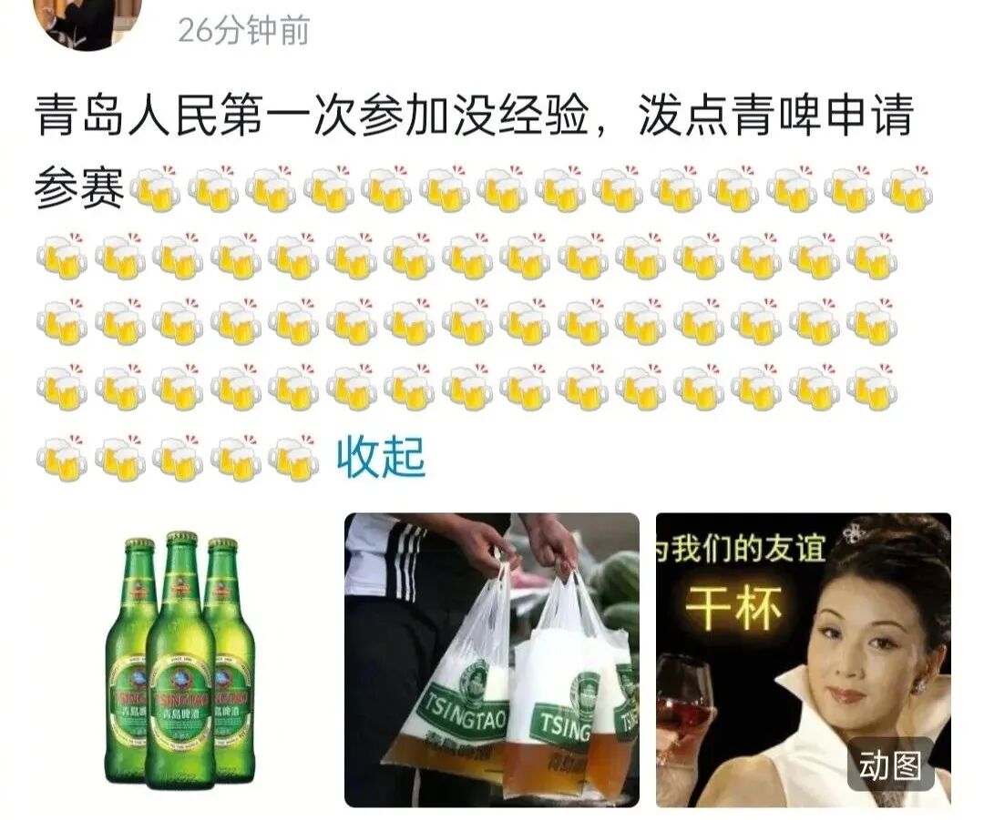 青岛人,带着啤酒给大家助助兴。