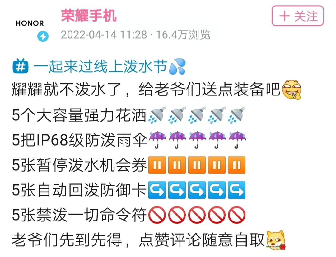 荣耀手机:我不泼水,我是来送装备的。