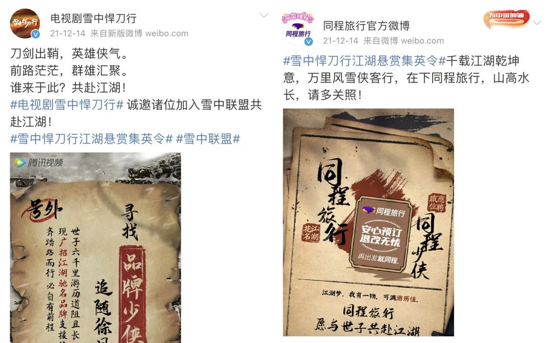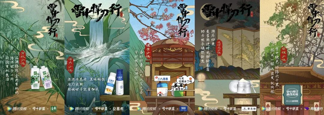 此外,雪中悍刀行官博还发布江湖悬赏集英令,诚邀金典、安慕希、麦吉丽、三九、同城旅行五大“品牌少侠”共赴江湖,将赞助植入品牌与剧集深度捆绑,通过个性剧情交互形式实现了品牌信息在影视剧中的潜移默化传播。