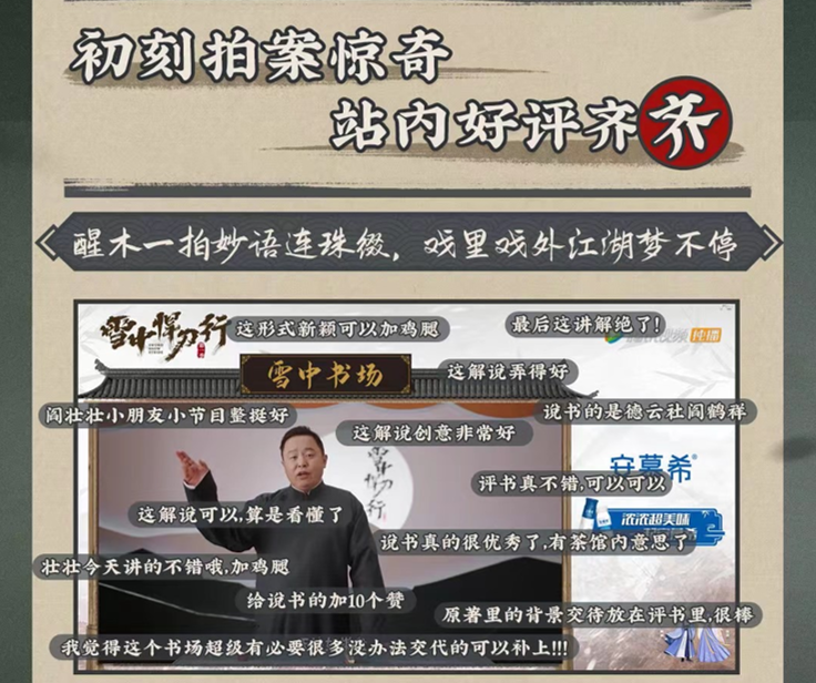 同时,腾讯视频还借助剧集内容二次创作,邀请德云社的阎鹤祥在剧集片尾打造江湖气十足的“雪中书场”,以评书形式承上启下解说《雪中悍刀行》的各大细节,同时在解说中适当融入各大品牌元素,伴随着剧情的逐渐深入,雪中书场内容持续推新,最终以高达2000万+播放量达成内容解读与品牌曝光的双向出圈。