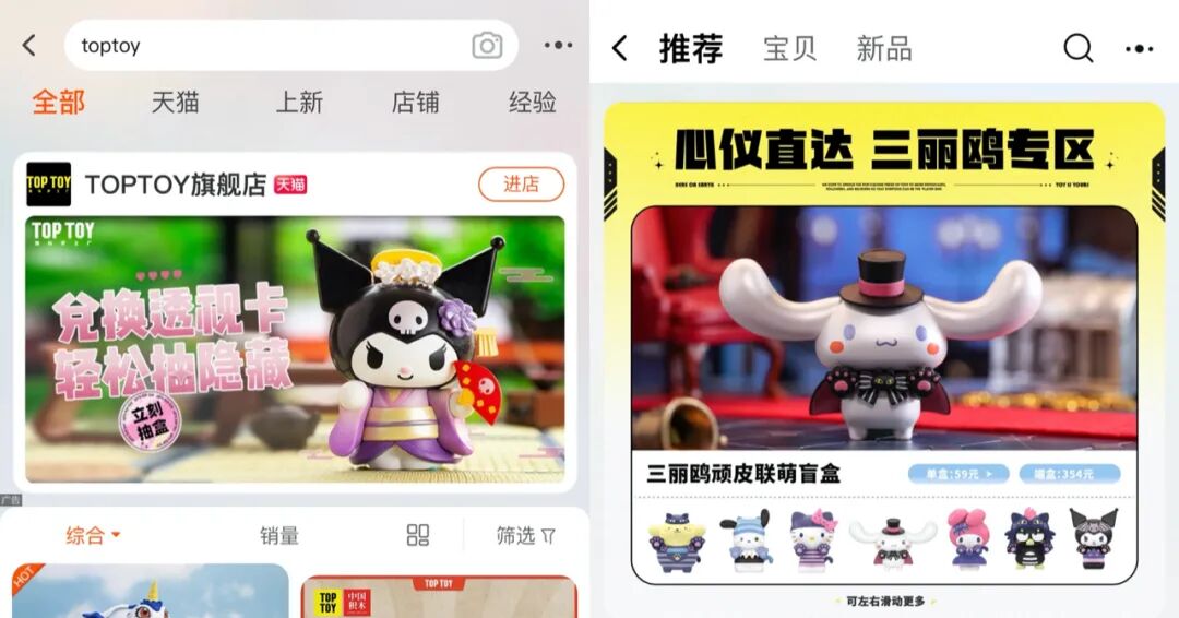 TOP TOY不高度依赖盲盒,发展多品类潮玩,似乎可以弥补原创IP不足的局面。TOP TOY的商品中,大约70%是外采商品,30%是自有商品。外采商品即从IP供应商或其他潮玩品牌处采购的现货商品,自有商品则分为非独家IP、独家IP和原创IP,和泡泡玛特的三种IP模式类似。由于外采商品占比过高,所以目前TOP TOY更类似于经销商,而不是品牌商。而这种过度依靠外采的模式,虽然帮助TOP TOY快速扩充商品SKU,但也很容易被其他潮玩品牌模仿和赶超。综合来看,TOP TOY当下以外采为主的商业模式,并不利于品牌的长期发展。在盲盒领域,是否具备成功的原创IP,意味着品牌能否在市场占主导地位。IP的开发能力,决定了潮玩品牌在盲盒、收藏玩具这两大品类的发展上限。近两年,盲盒领域的马太效应越发明显,热度不断向少量热门IP身上聚集,例如SKULLPANDA、DIMOO、FARMER BOB等热门IP的热度居高不下,在一二级市场普遍有高热度。与之形成鲜明对比的是,Nanci、Bunny等起跑线不低的IP,由于运营或开发不力,一二级市场越发趋于冷寂,距离头部IP的位置也越来越远。TOP TOY的盲盒产品,主要包括Twinkle、TAMMY、YOYO、VERA、Buzz等多个原创IP,以及三丽鸥、迪士尼等IP供应商授权的非独家IP。三丽鸥和名创优品合作多年,早在TOP TOY推出之前,名创优品推出的三丽鸥IP盲盒便获得了很好的销量,并帮助名创优品在潮玩领域打开市场。TOP TOY诞生后,三丽鸥系列盲盒依然是TOP TOY的中流砥柱。在TOP TOY天猫官方旗舰店内,三丽鸥系列盲盒长期出现在banner等位置,被重点营销,多个系列盲盒的销量均靠前。