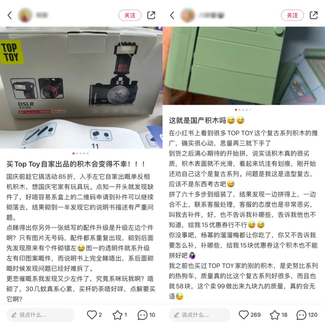 在积木类产品开发方面,IP的重要性大大减轻,市场更看重创新、质量、价格等方面。TOP TOY的积木类商品,多为国产积木,价格比乐高等海外品牌积木便宜很多。但质量和创新方面和乐高等知名品牌仍有不小差距。在小红书上,有不少消费者反映,TOP TOY的积木存在表面不光滑、贴合度不够好、说明书存在错误等质量方面的问题。在产品风格上,有资深积木玩家告诉「新熵」:“目前国产积木普遍走的是平价乐高路线,在产品系列、产品风格上都会向乐高贴近。比如国产品牌LOZ的多款积木和乐高的积木高度雷同。”