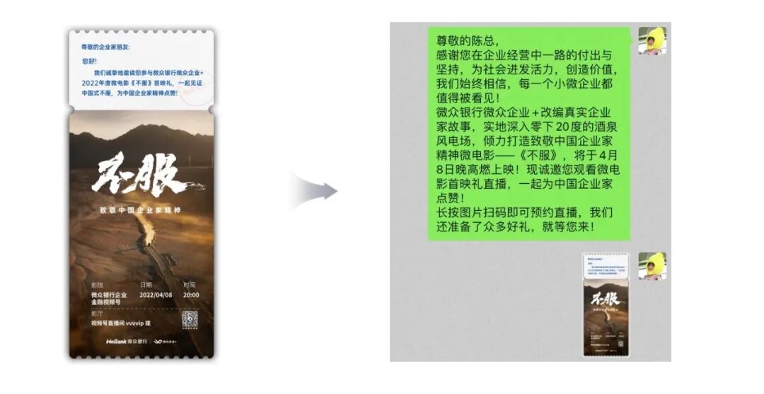 此外,为进一步强化品牌与目标用户的深度沟通,微众银行还独创发送定制“电影票式”邀请函模式,诚邀重点B端用户参与观看微电影首映直播,并精心打造微电影周边口罩,通过定制化营销服务抢占用户心智。