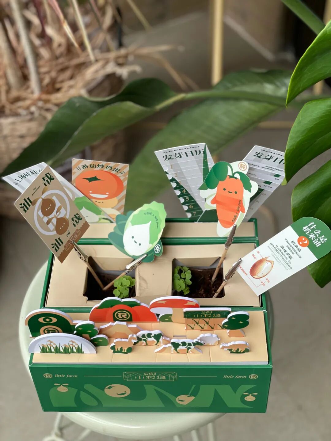 礼盒的设计别出心裁,将小农场“微场景”化,活泼的色调和「小农场」的小招牌,仿佛置身大自然中,瞬间氛围感拉满;礼盒自带种子、托盘和种植区,开箱即种,也完美解决了种菜小白“开头难”的难题。小卡片剧透了种子的品类,番茄、娃娃菜、胡萝卜都有可能在你的阳台出现,但至于是哪一种,就靠拆盲盒的运气了。