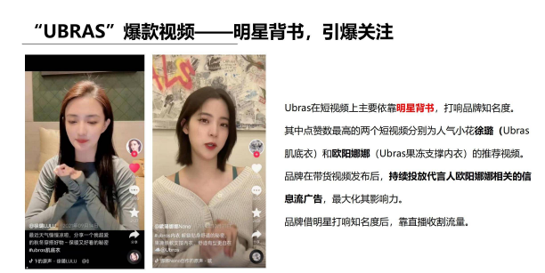 无尺码内衣开创者Ubras,更多的是借助徐璐、欧阳娜娜等明星背书,再结合代言人信息流广告,多元化深度种草,吸引用户。