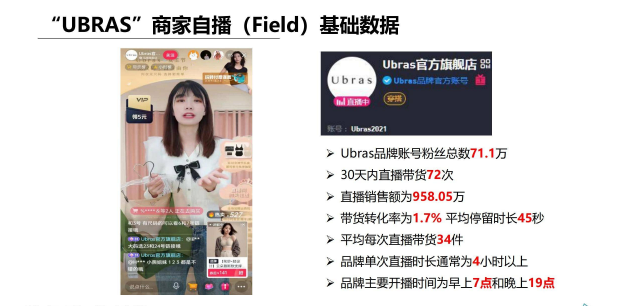 以Ubras官方旗舰店为例,帐号粉丝71万,30天内自播带货72次,销售额达958.05万。