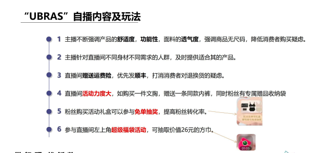 虽然比不上李佳琦等头部达人动辄十几亿的销售额,但作为自播这个数据还是值得肯定的。在自播玩法上,Ubras是遵循品牌倡导的悦已需求,spes强调产品的适用场景,也就是从产品本身的价值层面,刺激用户的消费需求。Ubras自播,购买一件文胸,赠送一条同款内裤,同时还会赠送粉丝专属收纳袋。Spes自播拍正装产品,送小样,吃准了用户爱薅羊毛的心理。