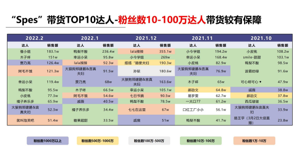 Spes投放的10万-100万的腰部达人,贡献了54%的销量额,而大量投放的素人和尾部达人则是效果不佳。