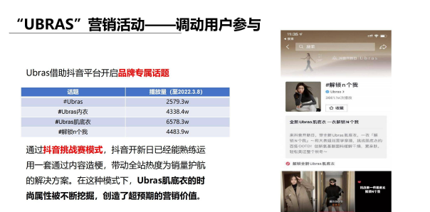 Ubras日常营销时,善于借助抖音平台开启品牌专属话题,比如#Ubras、 #Ubras内衣#、Ubras肌底衣、#解锁N个我,话题量总计近2亿。在内容形式上,采用抖音挑战赛模式,通过一套内容造梗,制造全站热度。一方面拉动流量,另一方面在用户参与过程中,主动挖掘Ubras肌底衣的时尚属性,放大营销价值。Ubras还玩转私域,为此打造了U喵这一品牌IP。用猫这一动物形象拉近年轻人的距离,同时私域个人号也延续这一IP,通过在朋友圈试穿以及活动预告,引流至直播间,形成营销闭环。抖品牌通过营销活动,实现规模化的流量聚集效应,短时间引爆品牌曝光量和集中交易量,是品牌快速成长的方式。05