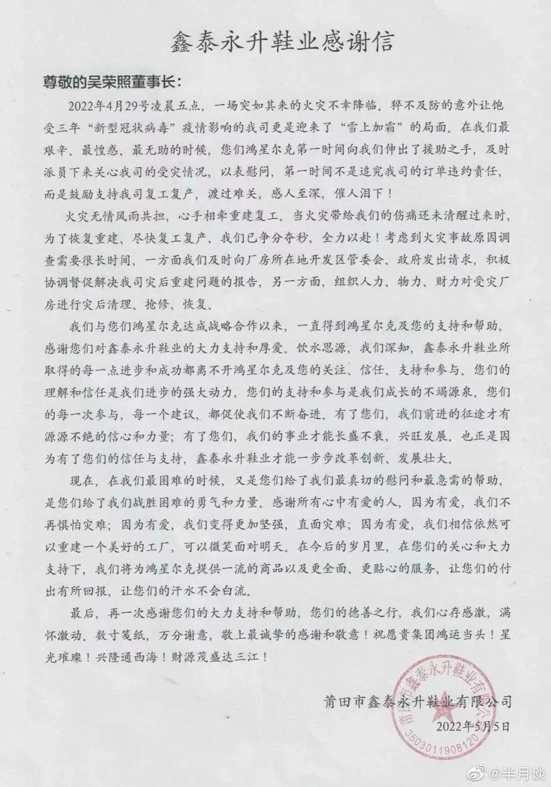 5月9日一个“我叫郑义”的公众号发布了这封给鸿星尔克的感谢信,故事令人动容。信中记录了4月29号发生在莆田的一场火灾,让一家名为鑫泰永升的企业的设备和货品一夜之间化为废墟。这家企业正是鸿星尔克的供应商,而郑义则是这家工厂的一位90后老板。本以为这下完了,自己的损失不说,违约金也是一大笔钱,几欲崩溃。但令人意外的是,作为合作方的鸿星尔克不但没有追究订单违约责任,还伸出援手专门派人查看受灾情况并给予帮助,鼓励该企业复工复产,渡过难关。这对于经历灾情的企业,无疑是一道有力的安慰剂与强心剂。作者连用“感人至深”、“催人泪下”的字句表达对鸿星尔克的感激!信中,郑义还详述了与鸿星尔克合作以来获得支持和帮助,并积极建议、参与鑫泰永升的发展。整篇感谢信读下来感人肺腑,质朴的文字里流露的全是感激。“你们帮助的不仅仅是一座工厂,更是工厂背后赖以生存的无数家庭,你们让我们深切感受到人间的真情,社会的温暖,让我们得以重振旗鼓,勇敢面对现实。”某种程度上来说,鸿星尔克对鑫泰永升的帮助不止是物资上的,更是精神上的。在我看来,这才是一个品牌最本真、最真诚的社会担当。02