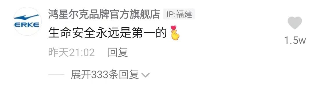 随着这封感谢信在网上流传,#一场大火让鸿星尔克又火了#话题被顶上热搜。或许这种事发生在其他品牌身上会让人意外,但网友们却纷纷表示:这很鸿星尔克!和去年豪捐5千万的场景如出一辙:网友力挺,新华社、半月谈等国字号媒体发文怒赞。在网友的评论中充满了“良心企业”“正能量”“国货之光”“大爱”等字眼!还有网友特意在鸿星尔克官博下留言:看到热搜过来给鸿星尔克点赞了!而这句话在去年河南暴雨鸿星尔克捐款5千万时,同样也被全网刷屏!但面对大家的盛赞,鸿星尔克却只是在新华社的评论区淡淡得回复了一句:生命安全永远是第一的。从被大家传“即将濒临破产”,但面对河南灾难依然捐了5000万元物资。鸿星尔克留给大众、社会的总是“行大于言”的真诚与善良。03