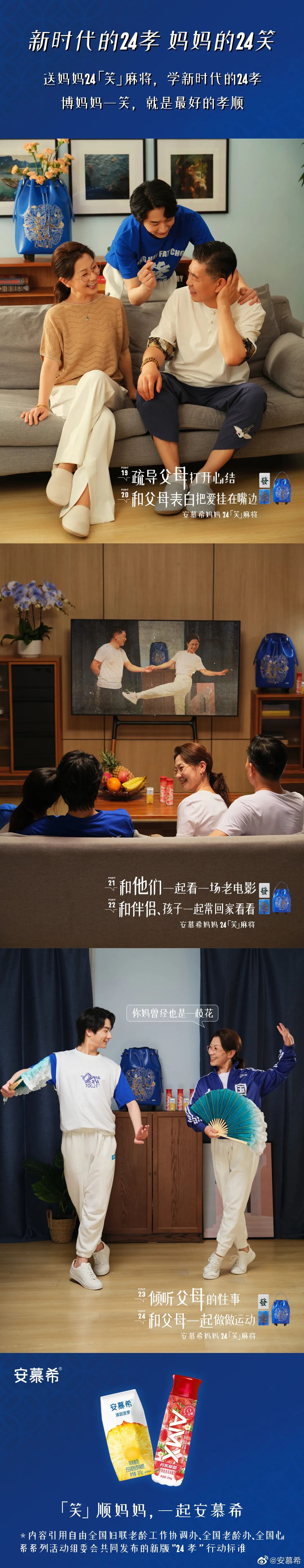 安慕希携手得物APP推出妈妈24「笑」麻将。24「笑」巧妙采用谐音梗24「孝」,用妈妈与麻将包的互动中产生的不同笑容,讲述不同令妈妈发笑的孝顺故事。点评:借势国粹创意理念为亮点,在结合麻将与产品特色巧妙融合,给人一种此物只供妈妈有的既视感。07
