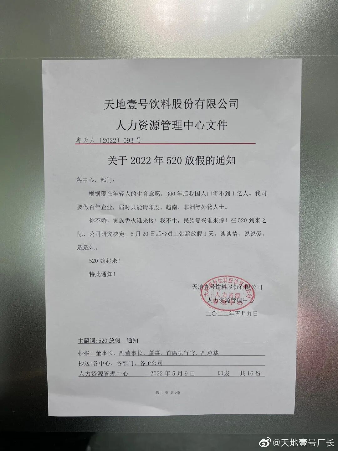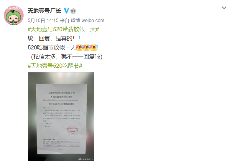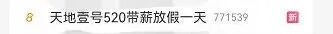 #天地壹号520带薪放假一天#登上了微博热搜。