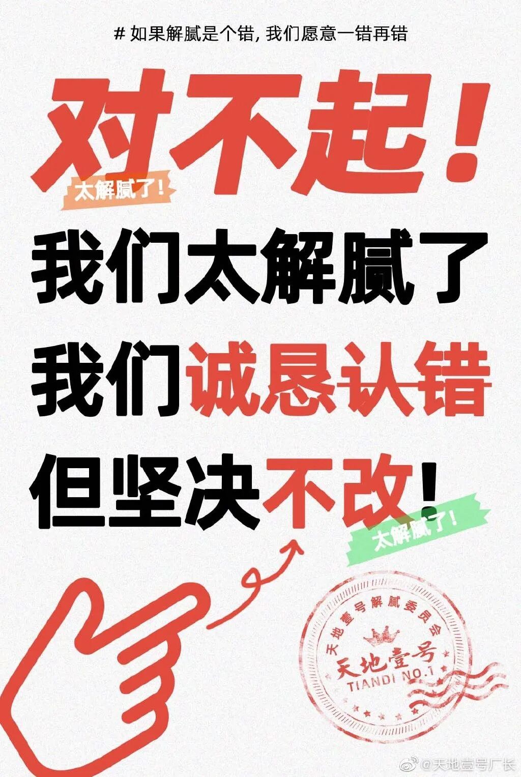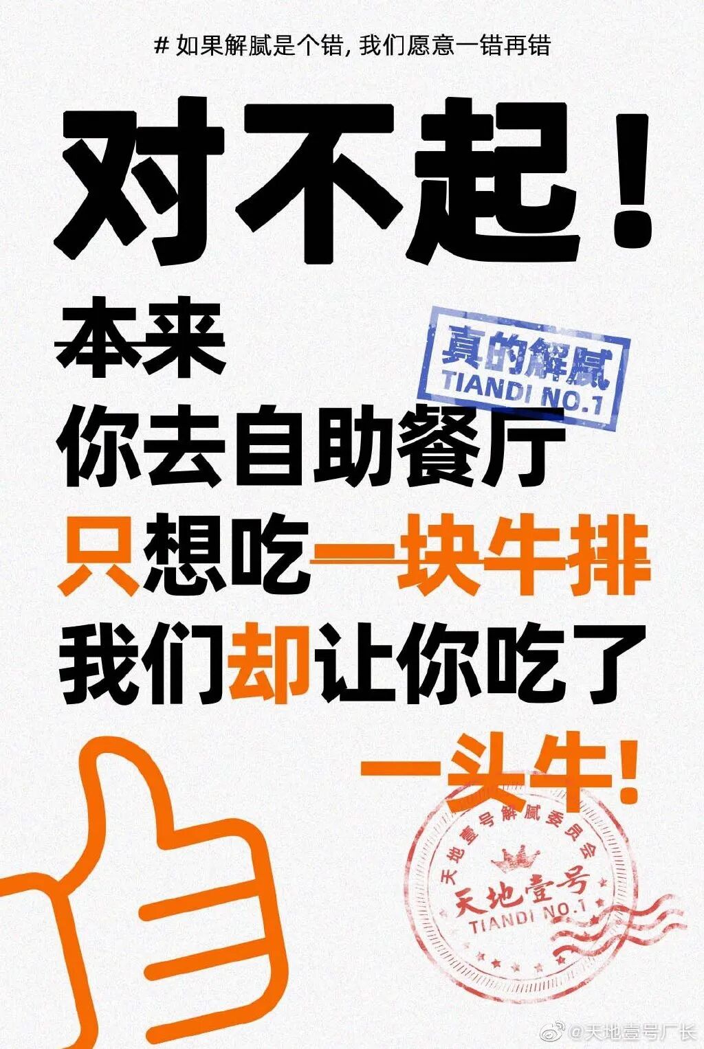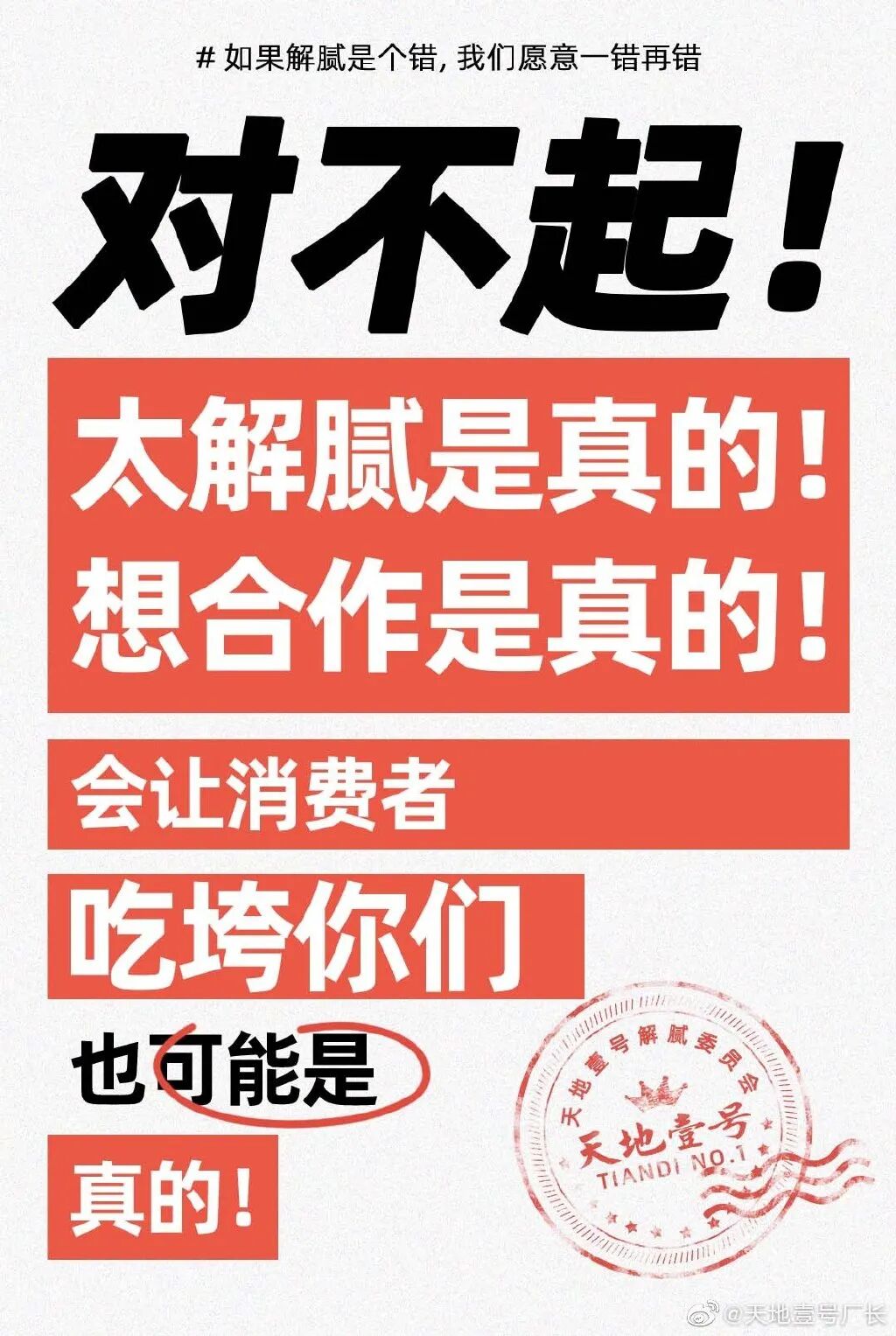 无辜躺枪的天地壹号,反其道而行之地发布了一系列道歉海报,表示