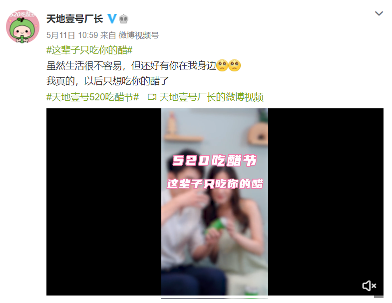 这次的520营销,天地壹号就提出了#这辈子只吃你的醋#、#天地壹号520吃醋节#等相关话题和互动玩法。