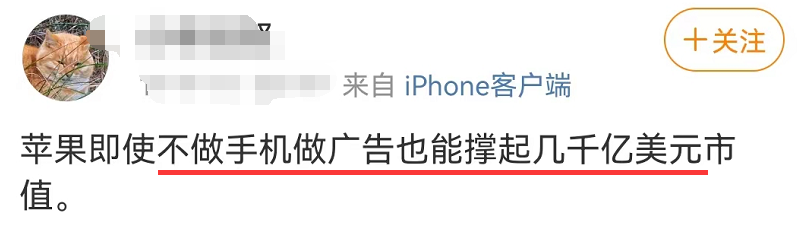 这一跌,苹果真的被咬了一口,难道苹果真的要失宠了吗?苹果市值那是以亿为单位,跌完还有15.93万亿,8000亿也就是亿点点。就像早上买小笼包,包子里的肉,只让猪受了点皮外伤而已。而且,就如这个网友说的,苹果不做手机,靠广告也能撑起千亿市值。