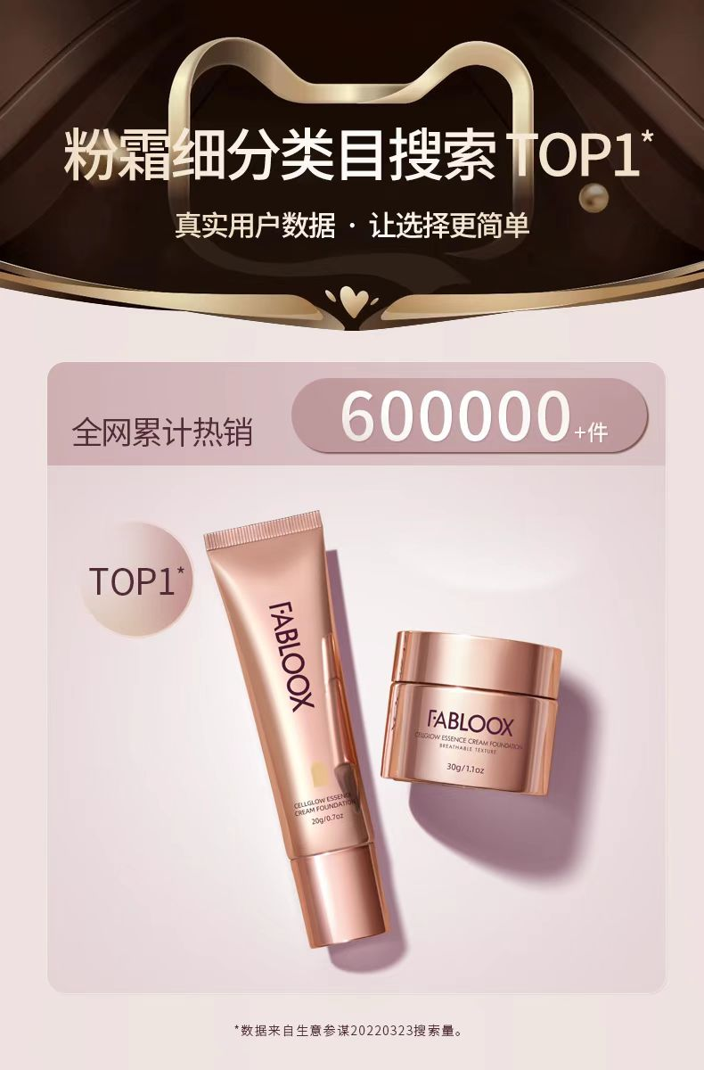 相较于普通粉底液,fabloox馥碧诗粉霜质地更绵柔更贴肤,延展力、遮瑕力更强,妆感效果突出且持久不脱妆,同时令肌肤滋润无负担。粉霜原料全部采用进口,由全球TOP原料商Symrise德之馨、DSM荷兰皇家帝斯曼等集团加持。这也让它位列天猫粉霜细分类目搜索TOP1,拥有了一大批明星、垂类KOL、美妆红人在各大社媒平台自来水种草,形成了颇具规模的“粉丝”效应。
