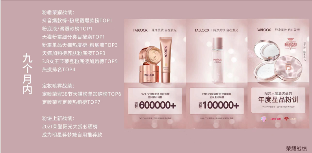 在粉霜的消费人群中,“Z时代”和“小镇青年”成为主力军,新锐白领和精致辣妈也显著增多,fabloox品牌年轻化的形象具有天然优势。品牌亦精准布局渠道市场,线上销售渠道全面铺开,粉霜上线9个月就取得销售600000+件的辉煌战绩。