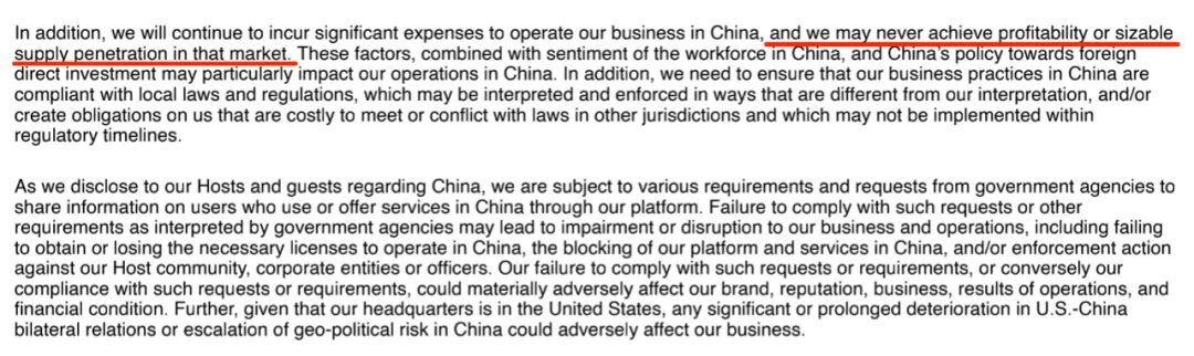 2020年财报中,爱彼迎Airbnb表示其在中国投入了巨资,这个市场竞争激烈,无论是从消费者还是人才角度来看,爱彼迎预计在中国经营业务将持续产生大量费用,同时表示可能无法在该市场实现盈利。