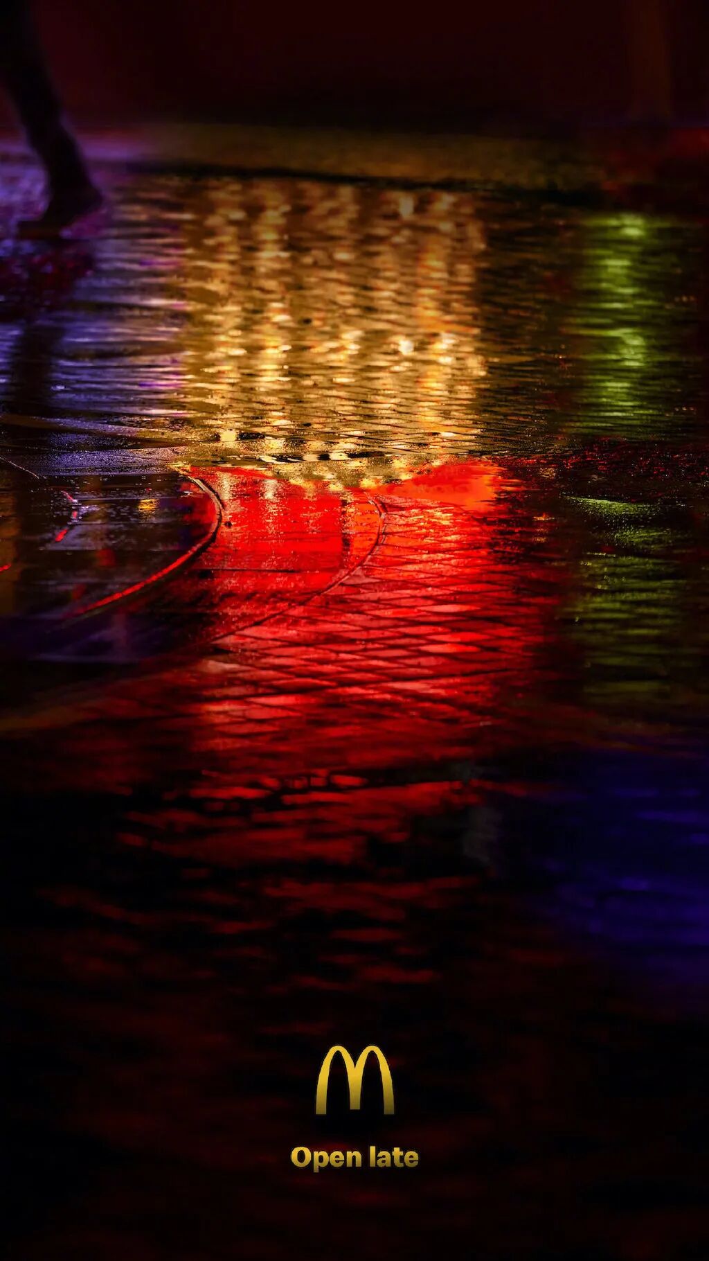 在雨后的街头,坑坑洼洼的街道反射出了微弱的光,尽管模糊不清,但还是让人一眼看得到麦当劳的那些单品,汉堡,薯条.....嗝~是谁还没饿呢?