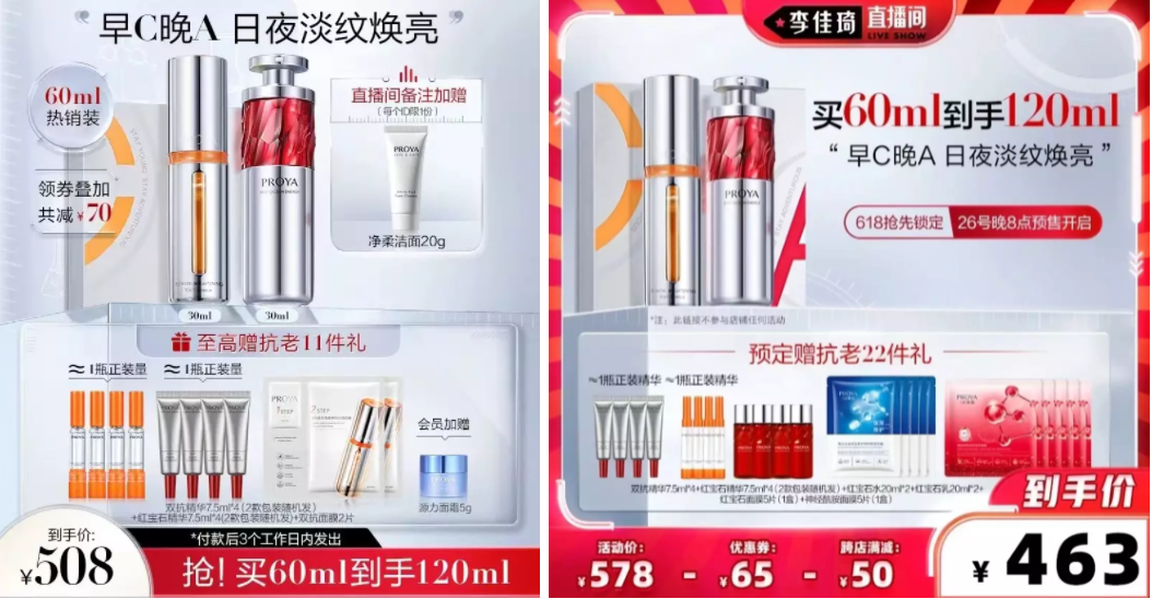 对如今回归理性的消费者来说,性价比是大促最核心的“剁手”理由。尽管早已不在直播间强调“最低价”,但在“加量不减价”的买赠机制下,李佳琦“最优惠”的人设不倒,尤其是在大促期间,“所有女生”似乎很难找到比李佳琦直播间更划算的渠道。第一个赶来与李佳琦打擂台、在他最拿手的美妆护肤品类叫板价格的,是手握中国中免、日上免税行和海南免税三张免税牌照的中国旅游集团中免股份有限公司(简称“中免”)。因疫情导致出行受阻、线下消费降温,近两年,中免开发了“CDF会员购”“CDF会员购海南”“中免日上”等多款线上购物小程序。消费者只需要注册登记身份信息(海免需提供离岛信息),即可直接购买各类香化、时尚等产品,不仅包税包邮,大促更是直接降价或打折。同时,中免还在小红书等平台铺设多个账号,通过比价、攻略等内容进行营销宣传,引流获客。得益于渠道优势,中免的线上平台商品尤其是化妆品类目的国际品牌,相比与品牌旗舰店合作的李佳琦,价格优势明显。开菠萝财经选取了10款李佳琦直播间618预售的爆款护肤品,与任意两个中免小程序比价发现,在小样与正装同等计价的前提下,仅有两款在李佳琦直播间“更便宜”。在“最低价”的加持下,中免的线上业务快速发展,逐渐被越来越多消费者熟知。去年11月,中国中免拟在港股上市,招股书显示,受益于线上业务的快速发展,该公司的有税商品销售额从2019年的11.5亿元暴增至2020年的197亿元,2021年仅前五个月,就卖出88亿元。保税仓,也是今年618淘系中腰部主播“对抗”李佳琦的一大杀手锏。据开菠萝财经观察,在618首场预售中,蜜蜂惊喜社、烈儿宝贝、香菇来了、陈洁kiki等主播的国际品牌美妆护肤产品,无一例外都来自保税渠道,蜜蜂惊喜社更是直接把直播间搬到了保税仓。这其实并不新鲜。去年双11,雪梨就凭借大量来自保税仓的货源,打出“一件单卖、现货直拍、不用凑单”的标签,单品价格也比“加量不减价”的薇娅和李佳琦更低,拿下9.3亿的单场GMV。今年618,位列李佳琦之下的主播们,亦采取了同样的“绕路”策略。例如,李佳琦直播间1150元买75ml送60ml的雅诗兰黛小棕瓶精华、2630元买60ml正装送42ml小样的海蓝之谜面霜,在蜜蜂惊喜社、烈儿宝贝、香菇来了、陈洁kiki直播间,分别为一瓶100ml正装499元、一罐60ml正装1499元。当晚,这些主播的保税仓产品大多售出1000-9000件不等,部分优惠力度大的均已售罄。尽管销量与李佳琦相距甚远,但在“正品、低价、现货”的加持下,中腰部主播们算得上是从“一哥”手里咬下了一口蛋糕。与背靠保税仓的主播们相比,被认为正在崛起的店播,在大促期间开始两头讨好。一个最直接的例证是,去年双11因店播价低于主播价、而被李佳琦和薇娅史无前例联手发出暂停合作“警告”的巴黎欧莱雅,今年618重回李佳琦直播间,当然优惠力度也是全网最大的。经过去年双11一役,店播价格不能高于李佳琦直播间,似乎已经是默认的行规。但开菠萝财经发现,大部分品牌的店播优惠与李佳琦直播间差距不大,而且,通过赠送更有吸引力的产品小样,店播正在对有不同需求的消费者进行差异化覆盖。例如,国货护肤品牌珀莱雅的爆款“早C晚A精华套装”,在李佳琦直播间售价463元,送同等量小样60ml、水乳80ml、面膜10片;在店铺直播间,售价508元,送同等量小样60ml、面膜2片、面霜15g、洁面20g,但后者才是珀莱雅正在力推的最新爆款。国际护肤品牌Murad的网红“A醇面部精华”,在李佳琦直播间售价498元,送同款精华10ml、VC精华15ml、VC洁面60ml;店铺直播间售价558元,送的是含金量最高的同系列眼霜5ml、面霜15ml、洁面45ml。“店播虽然没有价格优势,但对部分消费者来说,店播的赠品价值更大。”一位电商从业者向开菠萝财经表示,这或许是品牌在既不能得罪大主播、又要提升私域运营的两难境地下的“最优解”。“而且,在店铺优惠券、购物金、直播间加赠的多重加持下,究竟谁价格更低,可能还不得而知。”其补充道,很难说,去年双11的巴黎欧莱雅事件,会不会在今年618重演。“围剿”大主播,