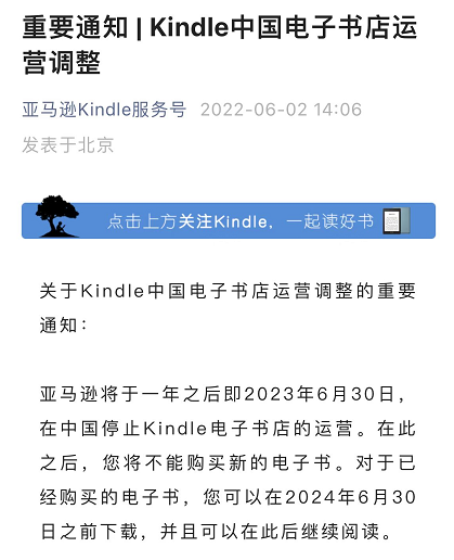 6月2日,“亚马逊Kindle服务号”发布了一则公告:将会在一年后的2023年6月30日停止中国Kindle电子书店的运营,在此之后将不能购买新的电子书,已经购买的电子书可在2024年6月30日前下载并继续阅读。