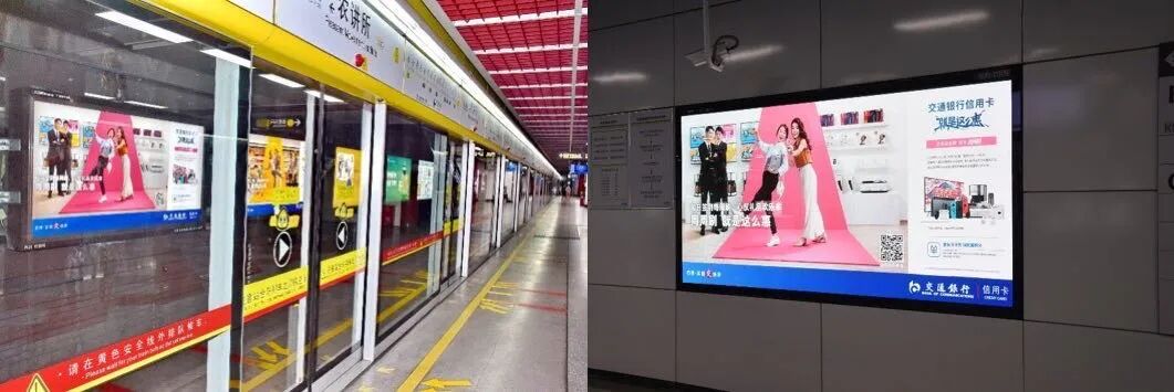与此同时,在投放渠道的选择上,交行信用卡还投放了商务楼LCD、地铁、户外广告等人流量极大的线下场所。亮眼、统一的主视觉画面的大面积铺开,形成了强烈的视觉冲击,短期内的风暴式投放,实现了“就是这么惠”的强势占位。广告上线之处无不吸引了大量消费者驻足,引发了广泛关注和讨论。