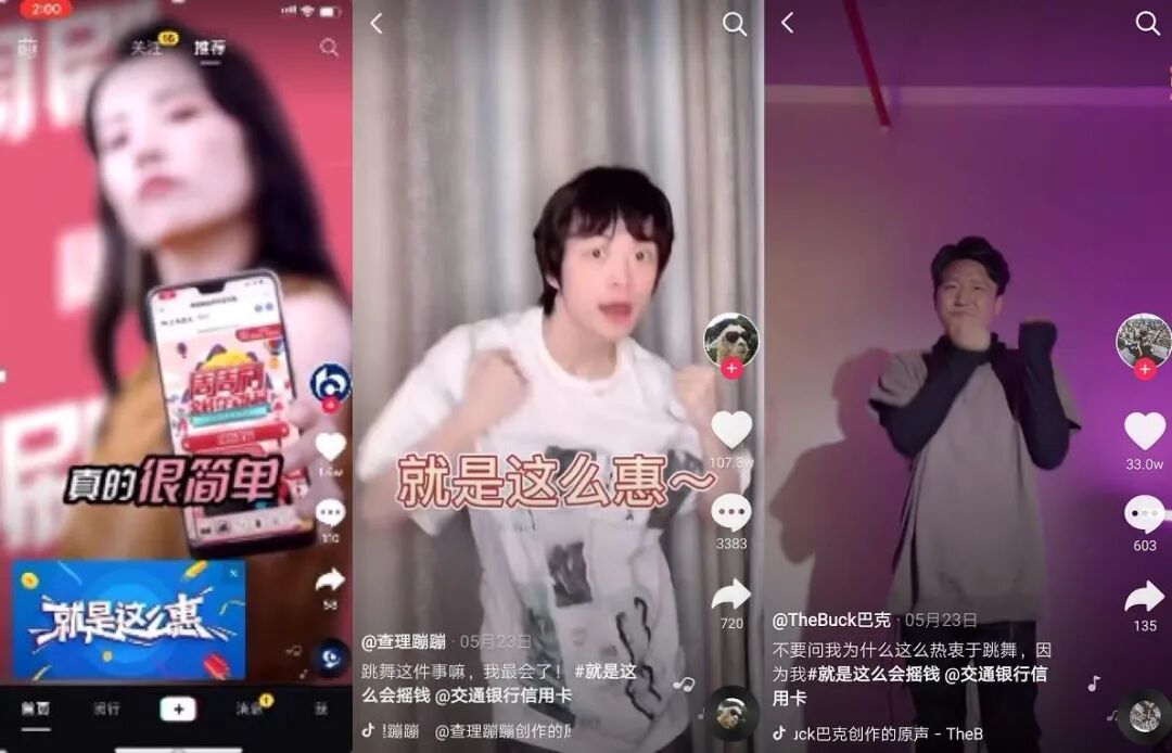毫无疑问,经过抖音巨量的流量放大传播,辅以各类常规渠道的全方位覆盖,交行信用卡#就是这么会摇钱#话题引发近千名抖音KOL参与互动,场面相当火爆。就抖音来说,渠道信息载体为视频,这种展示效果比文字、图片、图文带来的视觉冲击力更强。交行信用卡视频又能融入该平台的调性和氛围,用户看了视频感觉不突兀。