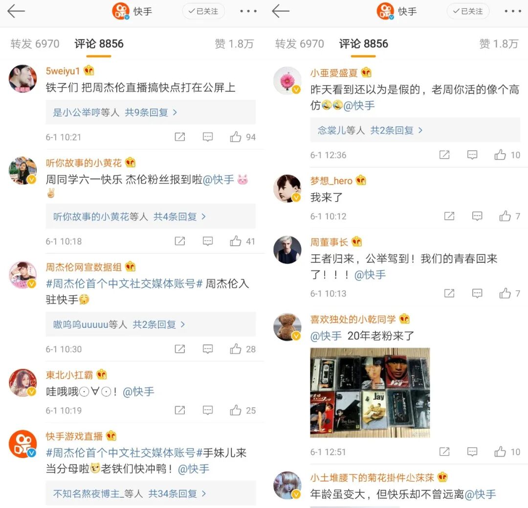 除了站外的传播,快手将站外的话题,延续到站内进一步扩散,锁定快手站内黄金广告位“精选推荐”的频道,为周杰伦定制了首焦banner。快手通过给予流量倾斜及个人品牌支持,吸引大家对于周杰伦账号的关注,最大程度扩大话题的影响力,足见快手对于周杰伦快手号上线的重视程度。周杰伦入驻快手的消息在网上流出之后,快手的官微留言区演变为“大型追星现场”,不少粉丝表示“期待期待”、“看来我得下载快手了”。