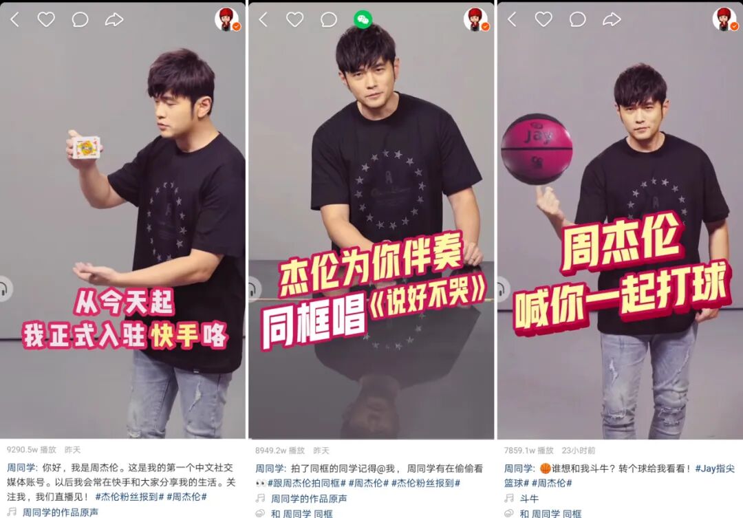 这次周杰伦入驻快手,也并不是一场毫无预热的冷启动。为了让这波入驻官宣扩散更大的影响力,快手前期就展开预热话题造势,营造应援氛围引爆入驻声量。首先在官宣形式上,快手充分借助周杰伦的人设特点和作品标签,向用户献上了一波明星梗海报。海报按照“3、2、1”的倒计时形式呈现,加入了周杰伦歌曲中带有数字的歌词,由此不断将话题推向高潮,可谓赚足网友粉丝对于偶像营业的强烈期待。最后的官宣KV海报的文案也简单粗暴——“周杰伦在快手”,不得不说,这画风品起来也很“快手”。
