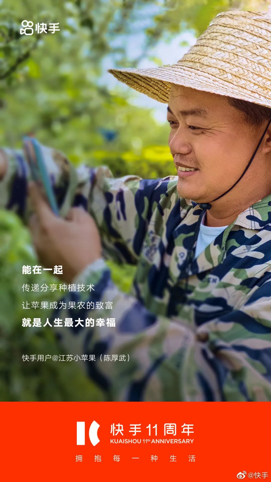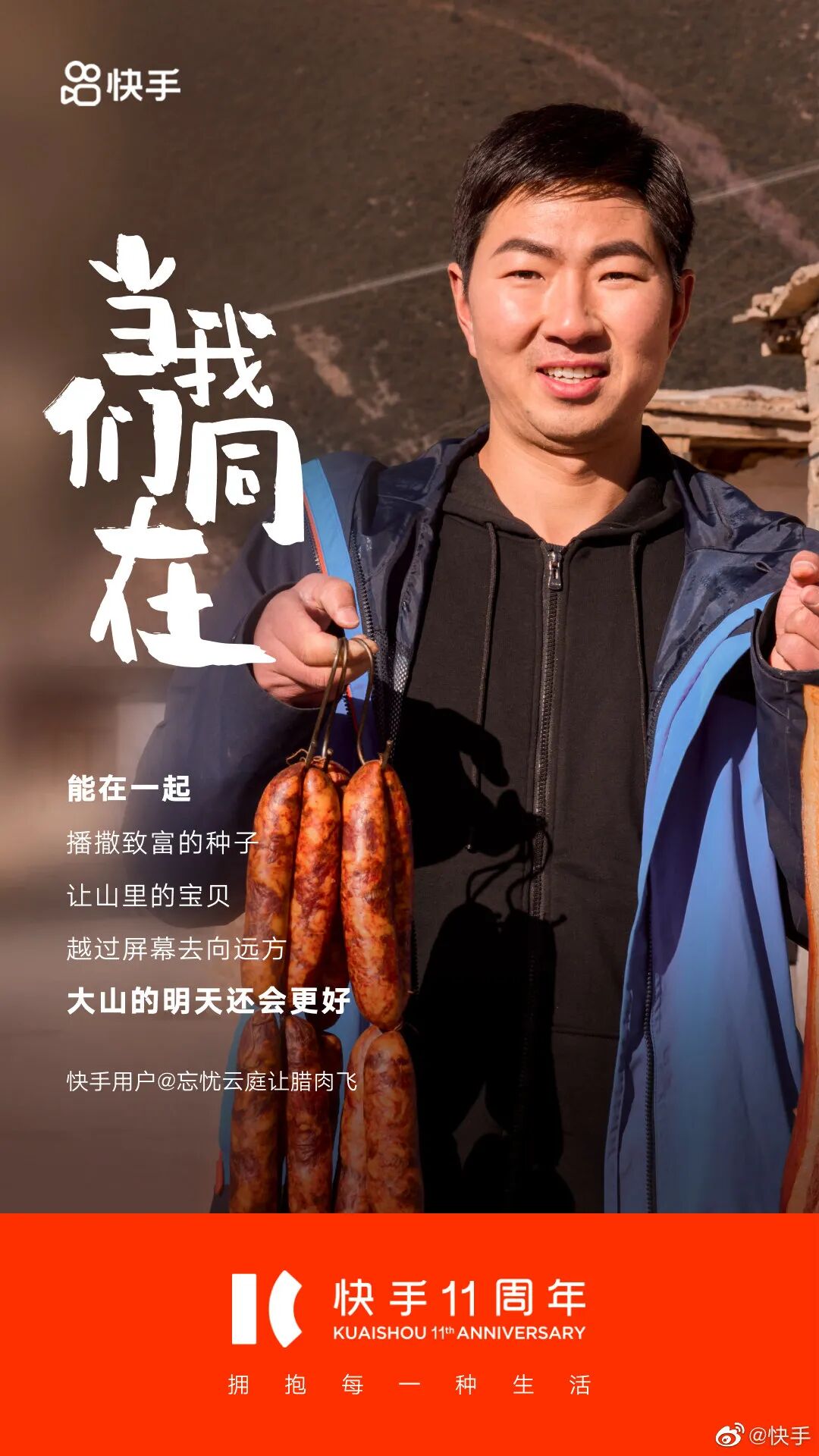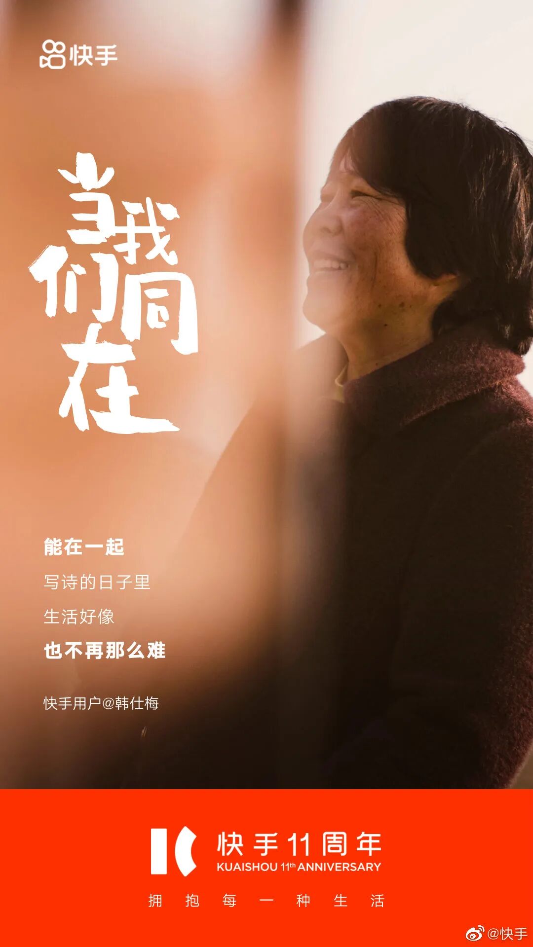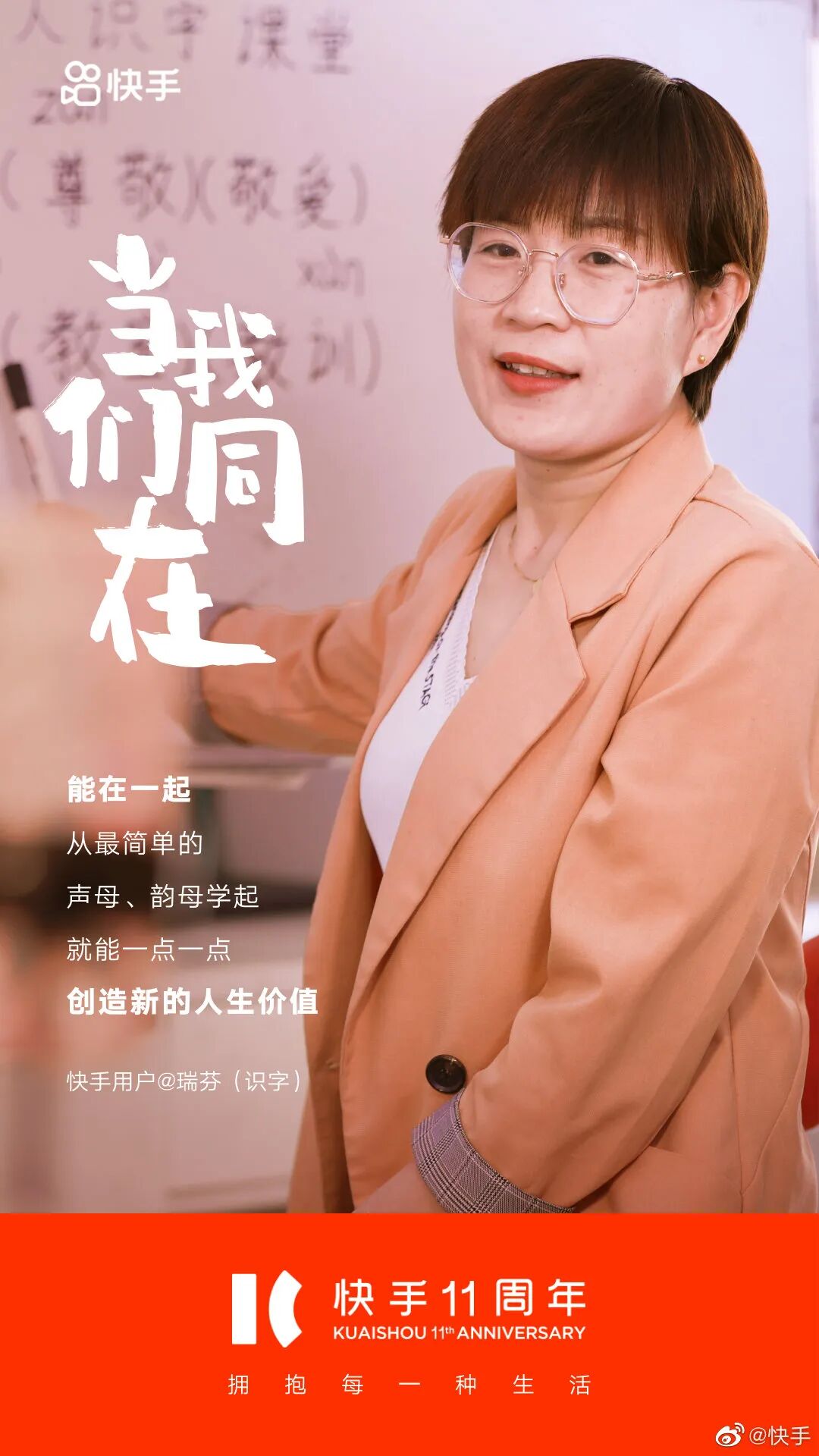 今天,无意间看到一支纪念快手11周年的宣传片。那一刻,我才意识到,原来快手陪伴了我们有11个年头了。十一年前,快手只是一款用来制作、分享GIF图片的手机应用。那时可能没人能预料到,这个软件在未来会成为很多中国人生活的一部分。十一年间,变化的不只是快手,更是数亿用户。无数来自普通人的故事因为快手被更多的人看见,人们的生活轨迹、人生方向也因为这个平台有了意外的改变。宣传片《当我们同在》聚焦用户故事,记录了与快手共同走过的短视频创作者们,并邀请受短视频创作者影响和帮助过的粉丝朋友,共同参与创作这支短片。快手选择聚焦个体,让普通人成为营销的主角,展现一个人和一群人的连接。快手发现从“我”到“我们”的力量,以集体叙事映射时代话题,体现出多重价值。快手注重讲好平台故事,传播普通用户的故事,就像这11位快手用户的文案海报。瑞芬教38万成年人识字。