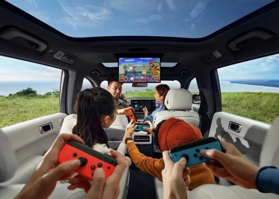 其中比较特别的是第二排上方的后舱娱乐屏,就像一个大彩电,坐实了理想L9“移动的游戏厅”、“移动的电影院”的定位。中控屏、副驾娱乐屏和后舱娱乐屏,是可以通过Type-C接口实现Switch一根线直连投屏的,在车上打游戏非常方便。