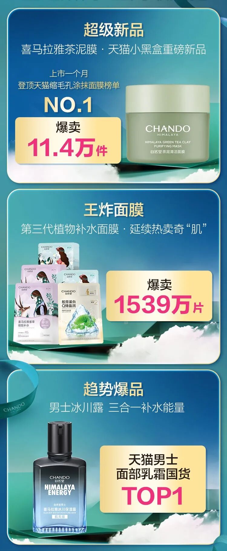 而在面膜系列中,自然堂新品茶泥膜天猫首发多次售罄;明星产品第三代植物补水面膜、安瓶面膜在自然堂各平台旗舰店爆卖。数据显示,今年618,新品自然堂茶泥膜在天猫爆卖11.4万件,并获得了缩毛孔涂抹面膜榜单排名TOP1。此外,男士冰川保湿露也收获了天猫男士面部乳霜国货TOP1。与此同时,自然堂“防晒小金伞”亲肤倍呵防晒乳、持妆粉底液等产品也在618期间卖爆。