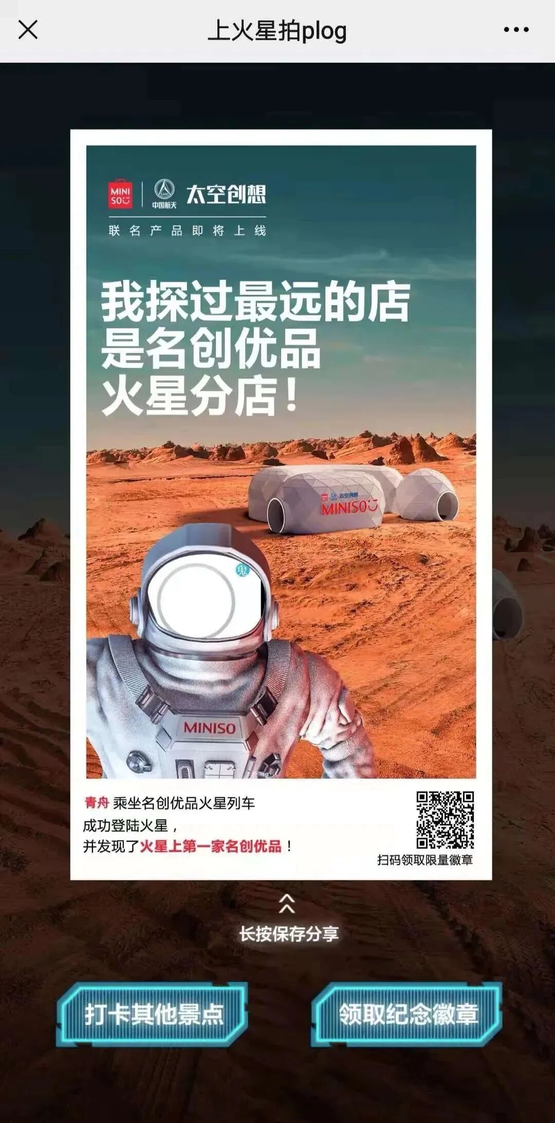 中国航天IP无疑是文创IP中的顶流,但流量时代想要打造爆款即使是顶流也不能依托于空白的话题。名创优品深谙跨界营销玩法诀窍,以用心打造内容,结合年轻化玩法成功出圈。火星作为银河系中距离地球且与地球最相似的星球,让人类产生了无限的憧憬。名创优品洞察这一现象,名创优品选择与中国航天IP开展深入合作,以火星概念店碰撞“在火星上开店”的奇思妙想。虽然目前的技术尚未实现真正移民火星,但名创优品却用心打造出逼真的火星观感,犹如真实踏入火星一般。在官方IP的合作下,“火星列车”、“太空舱”、“太空人”等元素迅速将大众拉入火星场景,开启一段神奇的沉浸式外太空之旅。在营销活动中侧面展现品牌实力、产品力是成功营销的巧妙之处。名创优品打造的太空舱班的“火星列车”内部装置了可以播放火星场景CG视频和名创优品火星概念店的宣传物料,借助高科技进一步提高用户体验感。名创优品采用特殊材料设计成功首创国内首个主题地铁车窗安置改造,不仅完善处理了安全、电压等实操性的问题,更展现了极高的广告创意实力,对于消费者而言,更是侧面展现出品牌的产品实力。发挥线上广互动玩法,推动品牌价值传导。用户可以通过名创优品“登录火星”H5实现360°观赏火星,扩充航天知识的同时被场景中的名创优品火星旗舰店、祝融号火星车、UFO等太空元素所吸引,进一步认知品牌营销信息。此外更设置了“合影Plog”功能,为用户提供与火星旗舰店合影的机会,留下他们在火星的足迹,从而形成与品牌的美好回忆。前流量时代,抢先追逐流量的品牌大获全胜。后流量时代,流量红利消退和消费趋于理性,品牌要沉淀内容产生差异化,抓住并引导消费者注意力,从而为品牌创造更大流量。名创优品与官方IP达成合作,成功以主导者身份加入了这场航天大狂欢,再用沉浸式的火星互动玩法吸引了大量年轻人的注意,进一步为品牌减龄。