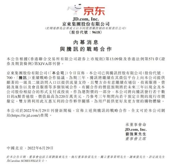 29日晚间,京东发布公告称,已与腾讯签订了为期3年的战略合作协议,腾讯将继续在微信平台上向京东提供显著的一级及二级访问入口以提供流量支持,而京东将向腾讯发行价值最高2.2亿美元的A类普通股。此外,在延续以往良好合作的基础上,双方还将加强技术创新、供应链服务等领域的合作。而这,恰好与京东加码供应链的战略相契合。彼时,国内的电商市场还是阿里、京东与腾讯的“三国杀”格局。淘宝稳坐一哥位置,马云更是放出豪言,称淘宝“打着望远镜都找不到对手”。京东则以追赶者的姿态步步紧逼。反观排在第三位的腾讯,却拥有着最多的电商平台。以易迅网为核心的自营业务、以QQ网购为核心的开放平台、以及以拍拍网为主的C2C共同构造了腾讯电商的“自营+开放”生态。当时,在京东拿到数亿美元投资,彻底在电商圈站稳了脚后,刘强东已经很有成就感了。因此他决定效仿王石,也出去走一走,上个学。于是在2013年,刘强东的美国游学之旅就这么诞生了。而这次游学之旅,也成为了压倒腾讯电商的最后一棵稻草。在后来的一档访谈节目中,刘强东回忆道,当时关于与腾讯合作的事情,双方已经谈了两年,但腾讯始终舍不得放弃电商这块大肥肉,总说再等等、再打打看。恰逢当时刘强东赴美游学,京东群龙无首,除了每周邮件外,刘强东几乎和公司没有任何沟通。时任腾讯电商董事长的刘炽平抓住这一千载难逢的机会,与马化腾一起调动腾讯所有资源、为腾讯电商灌流量、投物流,试图超越京东,甚至在内部喊出了“打猫狗”的口号。然而几个月之后,马化腾预想中的画面并没有出现。腾讯电商与京东的差距不仅没有缩小,反而更加扩大。对于腾讯而言,竞争对手的老板都不在公司,这仗还打的节节败退,那能怎么办?小马哥无奈只能投子认负。于是几个月后,中国电商史上最重要的格局变动之一出现了。腾讯将旗下QQ网购、拍拍的电商和物流部门等一并打包交给京东,并购买了后者3.5亿的普通股,正式从这片战场抽身。作为合作的一部分,腾讯也为京东提供了手机QQ和微信的一级入口位置及其他支持,合作期限长达5年。至此,腾讯与京东合作共抗阿里的电商格局诞生,并持续至今。在这一五年合约到期后,2019年,双方再度签订了为期3年的第二轮战略合作协议。根据2021京东年报,该部分流量支持、广告支出和其他合作金额将超过8亿美元。尽管一直以来,腾讯与京东在电商领域都保持着密切的合作关系,但随着拼多多的崛起,京东似乎并不再具备不可替代性。作为从微信平台拼购发家的拼多多,腾讯向来对其青睐有加。据此前拼多多公布文件显示,截止2022年3月28日,拼多多创始人黄峥持股27.9%,为第一大股东,腾讯则紧随其后,持股15.5%。一手京东、一手拼多多,腾讯在对抗阿里的路上有了更多的选择。甚至于在去年,京东还遭遇了腾讯的“清仓式”分红减持,这也引发外界阵阵有关双方“分手”的传闻。2021年12月,腾讯宣布以中期派息方式,将所持有约4.6亿股京东股权发放给股东。在本次派息后,腾讯原17%的持股比例将直接下降至2.3%,不再是京东的第一大股东。这样的派息方式,在中国上市公司中尚属首次,获得京东股份的腾讯股东将直接成为京东的新股东。与此同时,腾讯总裁刘炽平也卸任了京东董事。这件事被外界认为或是腾讯与京东分手的前兆,受此影响,京东股价一时大跌11%。直到此次双方的第三轮战略合作,才算吃了颗定心丸,冲淡了双方“分手”的隐忧。今年以来,京东始终深陷亏损泥潭。2022年第一季度财报显示,京东该季度净亏损30亿元,较去年同期的盈利36亿元转盈为亏;营收同比增长了18%至2397亿,但这一增速是自京东上市以来的最低值。与此同时,京东还传出拆散京喜事业群、进军外卖等消息。可以说,此次双方合作的继续,是帮助京东维持稳定的重大利好消息,腾讯将为京东继续提供强大的流量入口,让京东的状况不至于太差。在延续以往的流量支持外,此次合作中最重要的一点,便是双方在技术创新、供应链服务领域的合作。前者侧重于在人工智能领域技术交流合作的加强,后者则集中在京东为腾讯提供供应链金融、智能物流等方面的服务。事实上,供应链也正是京东所持续深耕的优势领域。在疫情肆虐之下,物资短缺、物流堵塞、网点停摆,越来越多的人意识到供应链的重要性。而得益于对供应链大中台的持续搭建,在4月份疫情最严重时的上海,京东也始终在坚持运营,且恢复能力早于其他企业。就在今年3月,京东物流还与德邦物流达成了战略合作,将收购后者66.49%的股份,并在快递快运、跨境、仓储与供应链等领域展开深度合作。拥有着此等实力,这也难怪京东零售CEO辛利军敢放出“我们正迎来供应链价值元年”的豪言。在此次与腾讯的合作中,京东也将与腾讯继续加强技术合作,借助腾讯的技术能力,双方合作的成果未来也将反馈至京东的软供应链体系。在如今这个处于“变革”的时代,电商早已不是单纯的电商。阿里云计算、京东押注供应链、美团也确定了“零售+科技”的战略方针。在未来,任何一家电商企业都不单单只有电商,唯有同时发展技术,才能有自己的立足之地。阿里、京东、美团等均是如此。押注技术与供应链,也是在这个“变革”时代,京东为自身高质量发展所走出的长远道路。