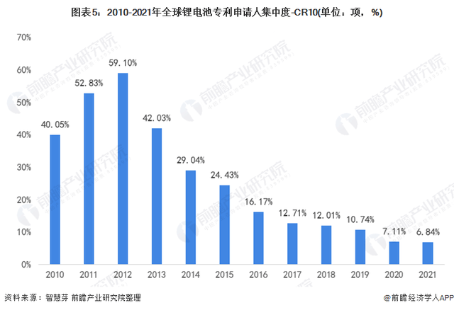 至于后续增效方面,全球锂电池技术瓶颈或许比矿产资源还令行业头疼。2010-2021年8月,全球锂电池专利申请人呈现先上升后下降的趋势, 其中,2012年达到最高点59.10%,随后下降至2021年8月的6.84%。